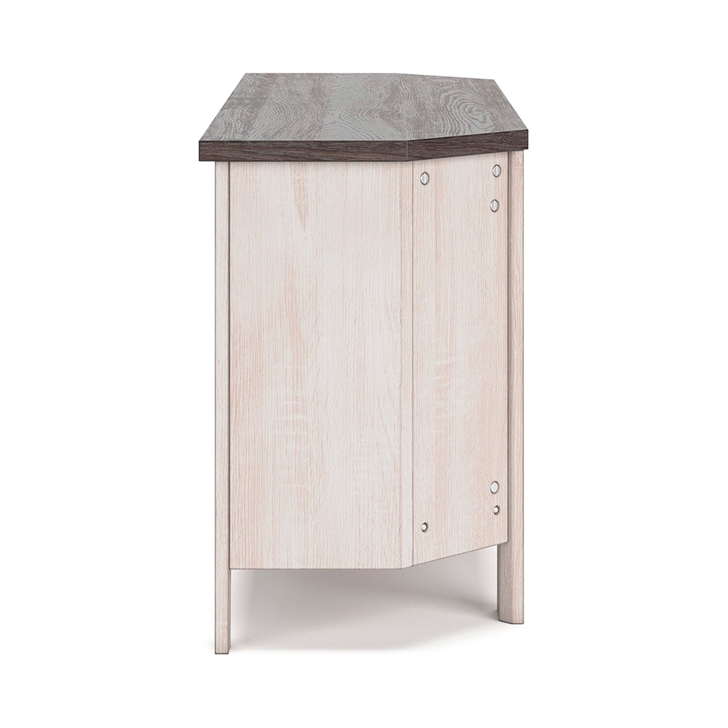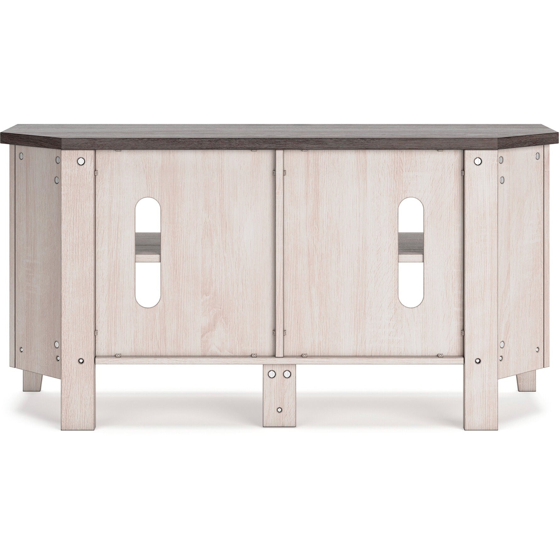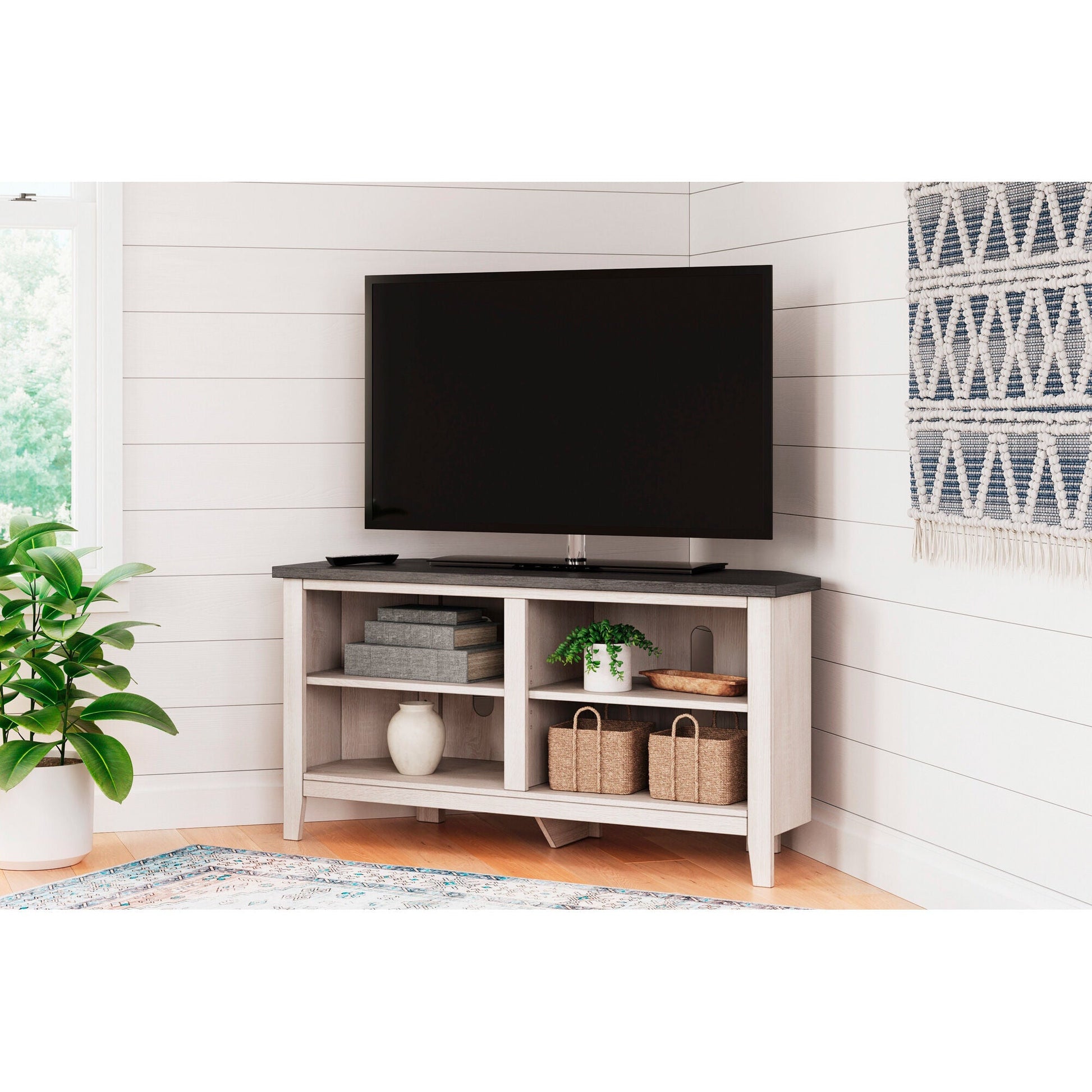 With its minimalist charm, this TV stand is right in tune with your relaxed approach to high style. Beautifully shaped to nestle into any corner, it's well equipped with a flexible open-concept design and cutouts for wire management that enhance the clean-lined aesthetic. The look is ideal for modern farmhouse and contemporary settings.