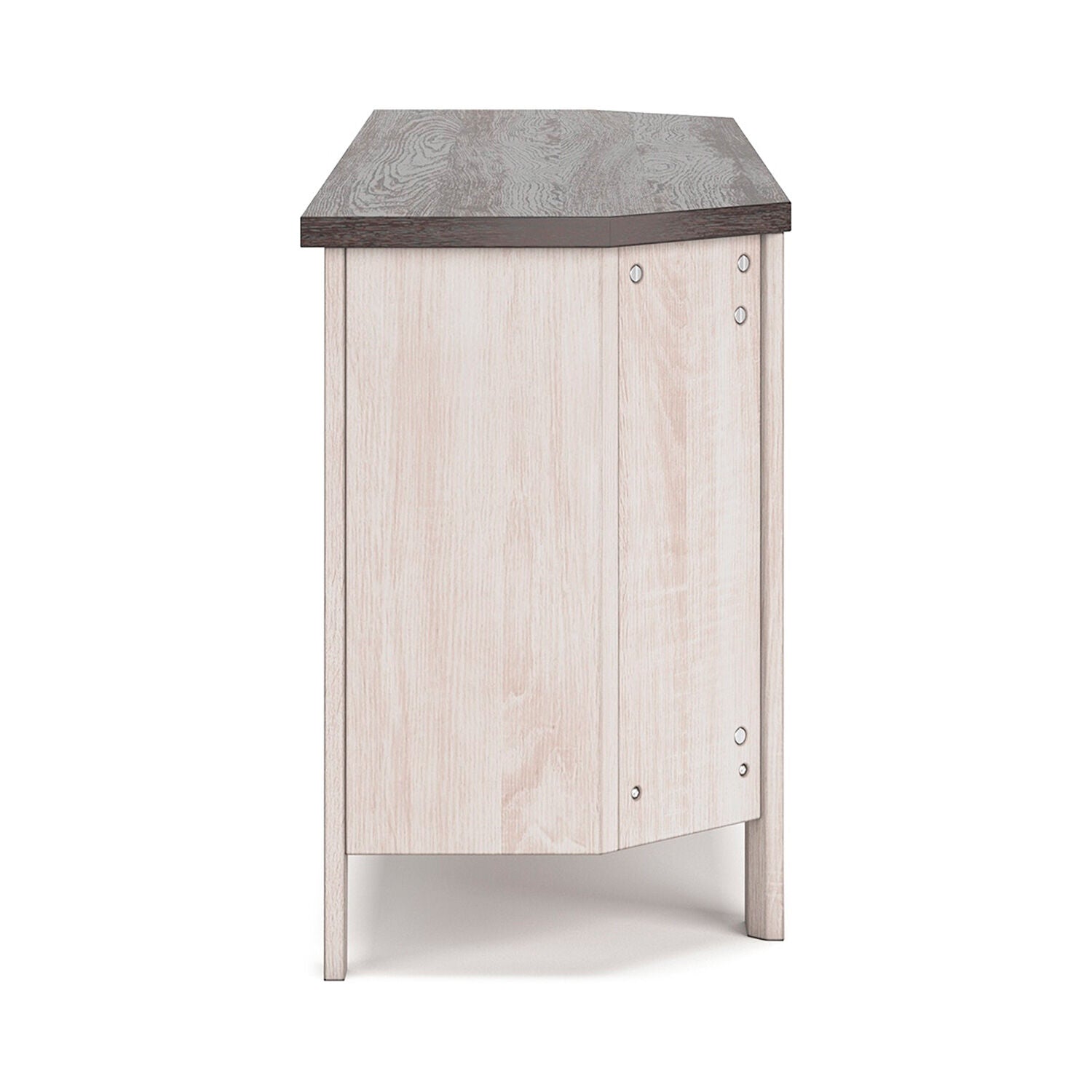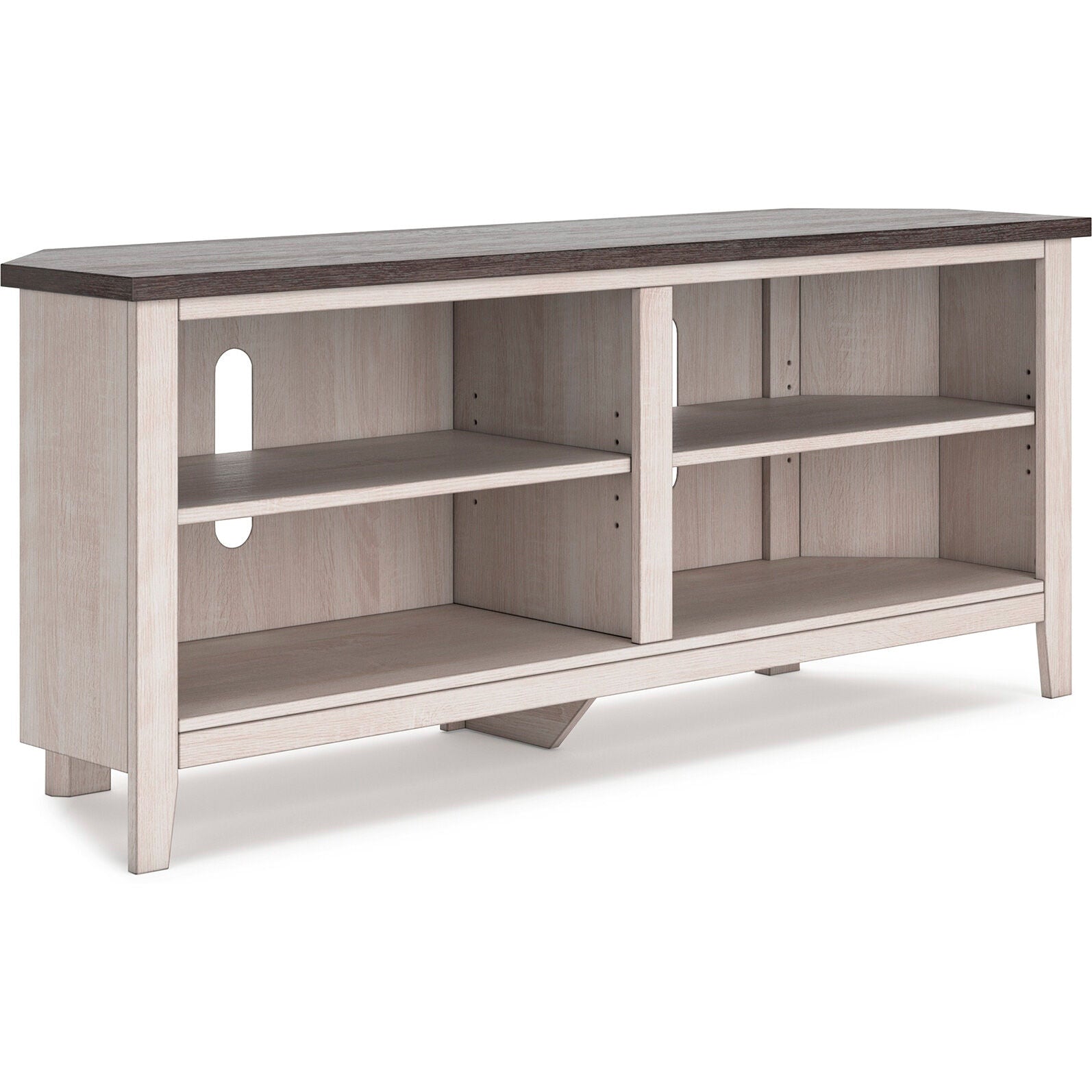 With its minimalist charm, this TV stand is right in tune with your relaxed approach to high style. Beautifully shaped to nestle into any corner, it's well equipped with a flexible open-concept design and cutouts for wire management that enhance the clean-lined aesthetic. The look is ideal for modern farmhouse and contemporary settings.