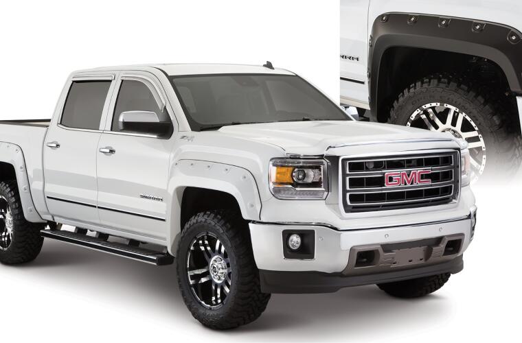 With their surface-mounted Stainless Steel bolts and massive presence, Boss™ Pocket Style(R) Fender Flares are a Bushwacker exclusive. Despite their aggressive bolt-on styling, Boss™ Pocket Style(R) Fender Flares install in minutes, with only minimal drilling required. They're custom-designed for your GMC Sierra to complement oversized tires and high-clearance lift kits. You can mount them right out of the box, with their tough, OEM-style matte black finish - they're UV protected so they won't chalk. Or, paint them to match or accent the body color, for a factory-custom look. Boss™ Pocket Style(R) Fender Flares are made in the USA from our thick, warp-resistant Dura-Flex(R) 2000 material, tailor-made for added durability and flexibility on the trail. When you need maximum tire coverage with minimum time and effort, it's in the pocket. Boss™ Pocket Style™ Fender Flares from Bushwacker.