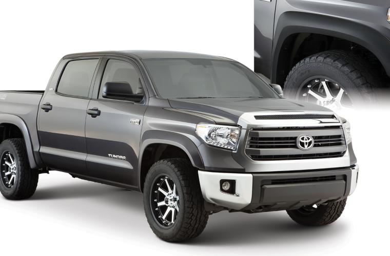 You've equipped your Toyota Tundra with oversize wheels and tires for serious off-road traction and style. Now you need extra tire coverage to protect your rig's body and maybe even comply with local laws. Bushwacker Extend-A-Fender® Flares deliver premium-grade protection and style matched to oversized tires. Yet, as tough as they are, they go on easily with no drilling required. You can install them in minutes and enjoy them for years - our exclusive Dura-Flex® 2000 material is designed for added durability and flexibility, with built-in UV protection. Your Extend-A-Fender® Flares resist chalking, cracking, and warping, whether you leave them with their OEM-style matte black finish or paint them for a totally personalized look. Either way, your Toyota will look factory-equipped for your big off-road tires. Extend-A-Fender® Flares go on easy, perform tough, and look great.