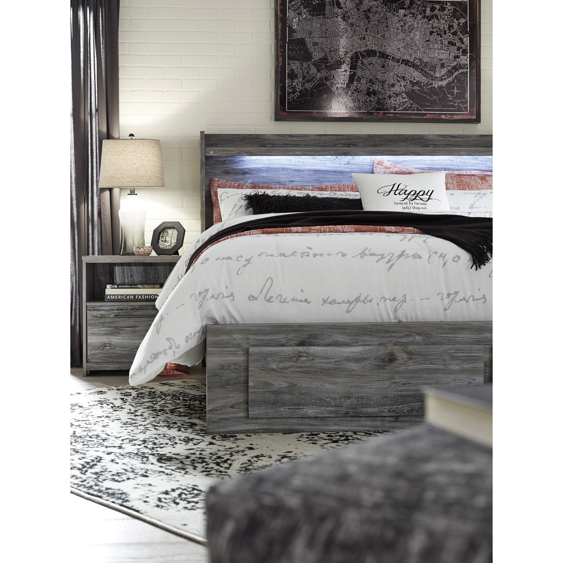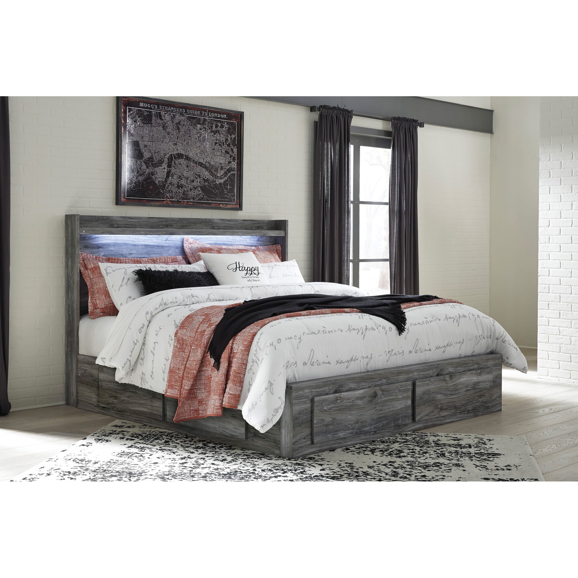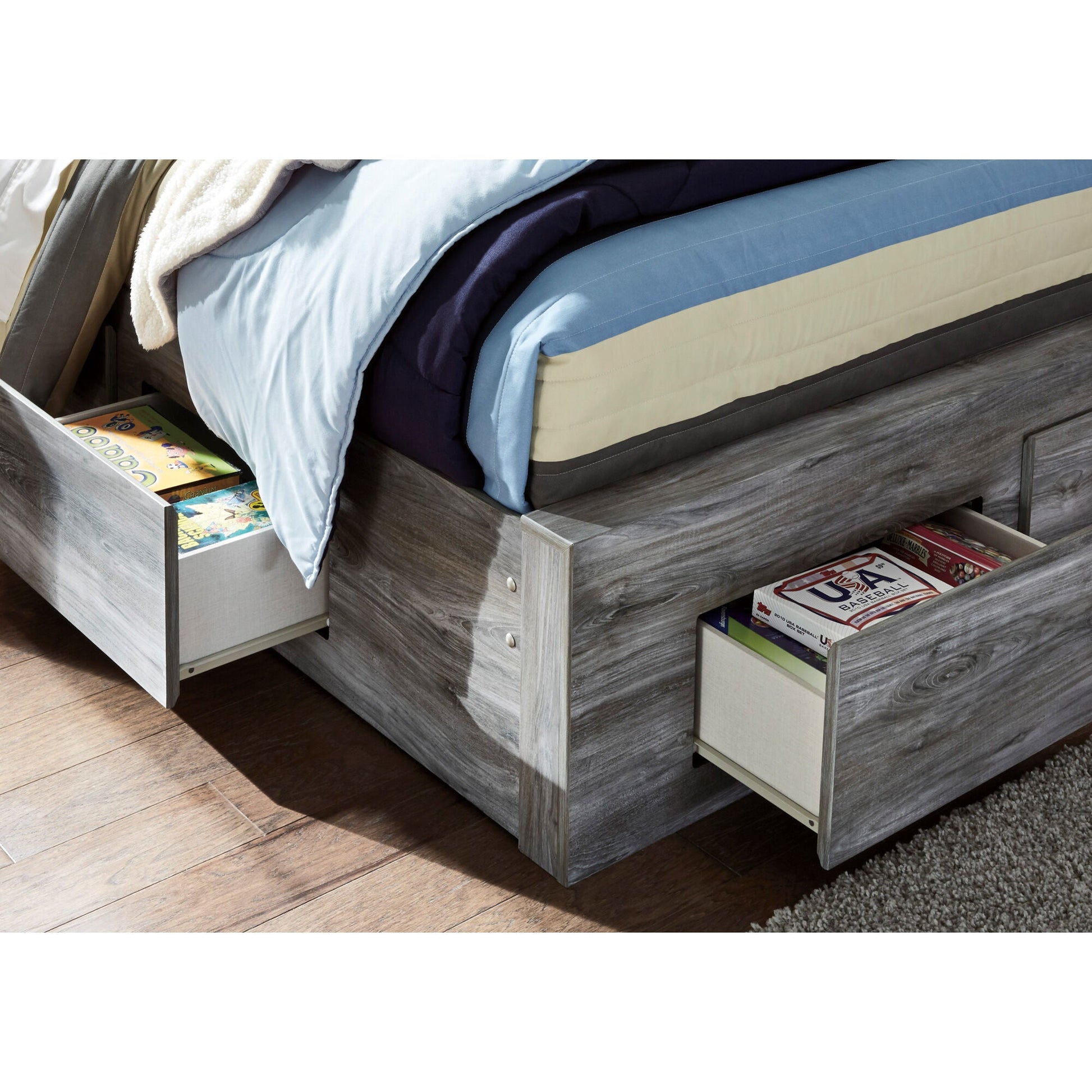 Rest in the beachy style of this full panel storage bed. Its driftwood and surfer-inspired smoky finish and cool LED lighting give this bed a rustic look that's perfect for creating an island oasis. Keeping everything neat and tidy, six smooth-gliding drawers provide plenty of under bed storage. Mattress available, sold separately. - Product Details provided by Manufacturer, Slumberland not responsible for errors in information.