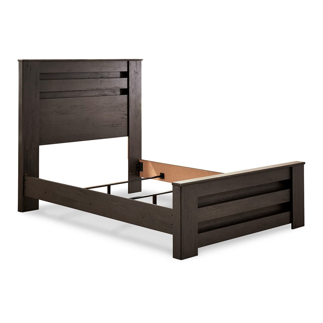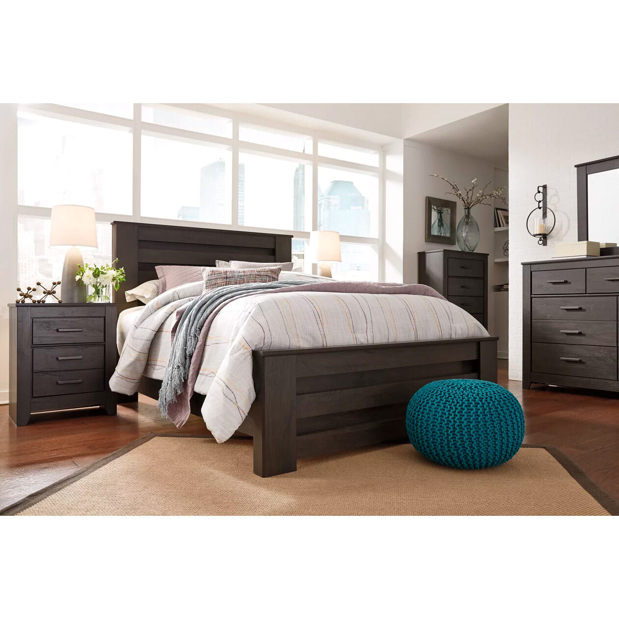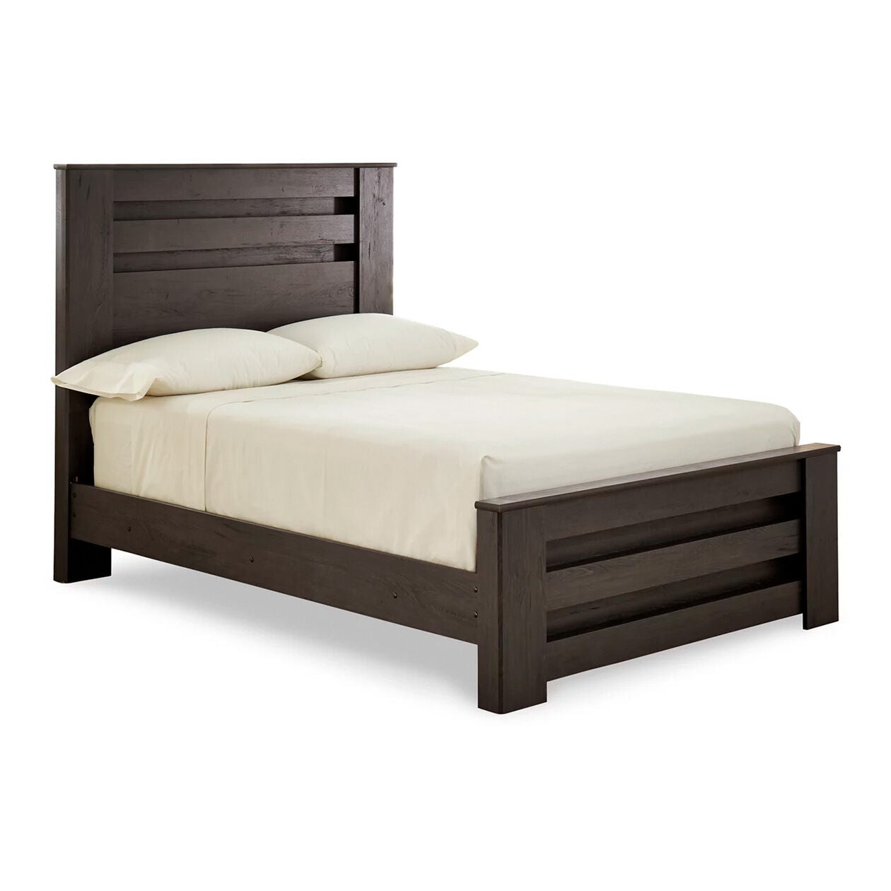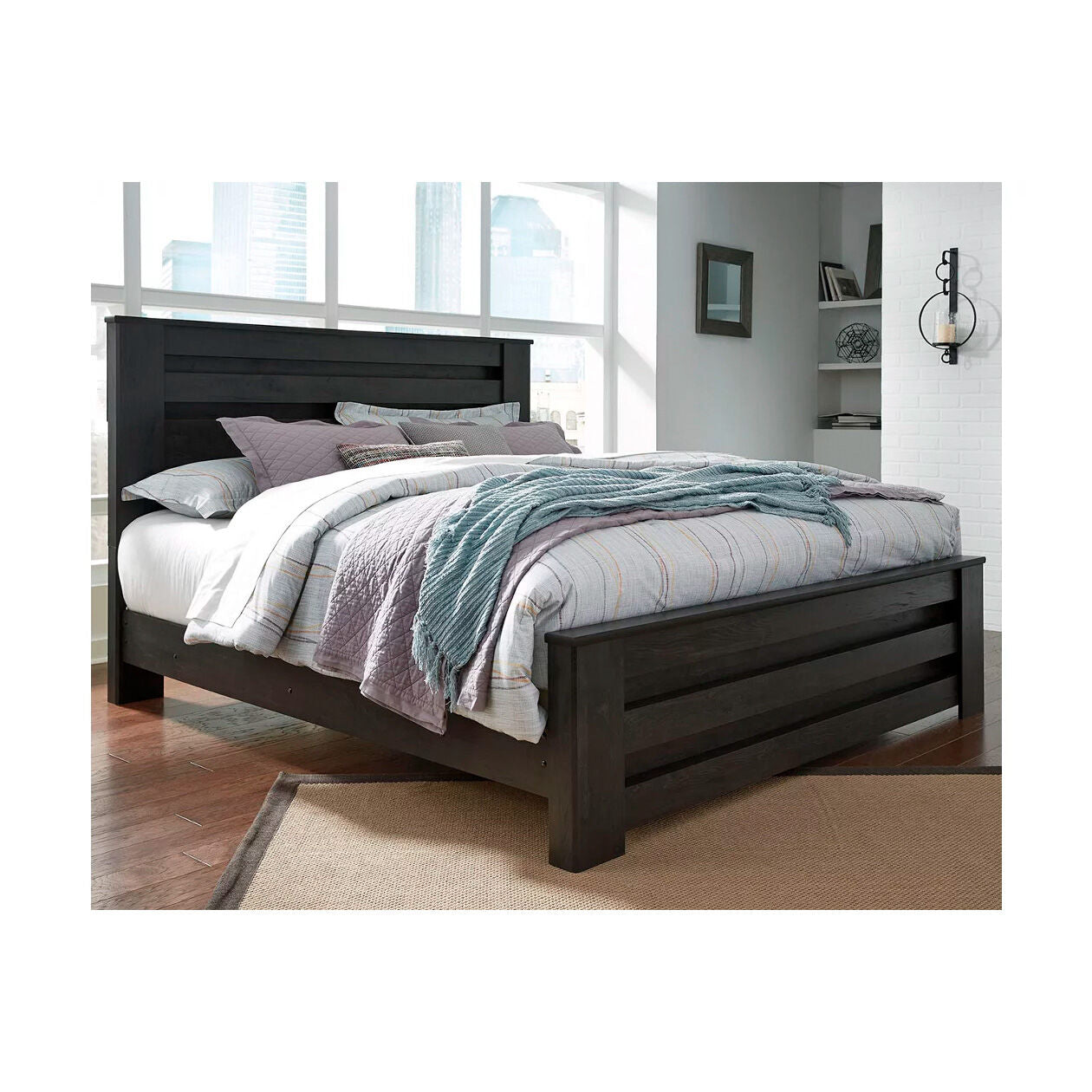 Priced to entice and styled to impress, this alluring king panel bed is urban sophistication with a decidedly relaxed air. It's got the crisp, clean lines of a contemporary piece, but with an earthy element. Deep, horizontal grooves infuse depth and dimension, a replicated oak grain effect gives the charcoal gray finish warmth and character. Mattress and foundation/box spring sold separately.