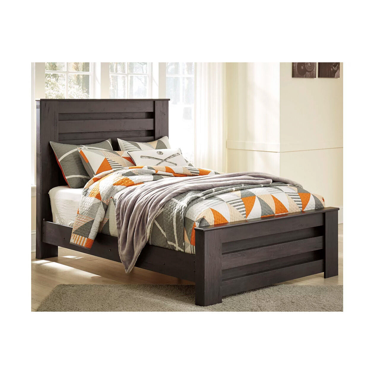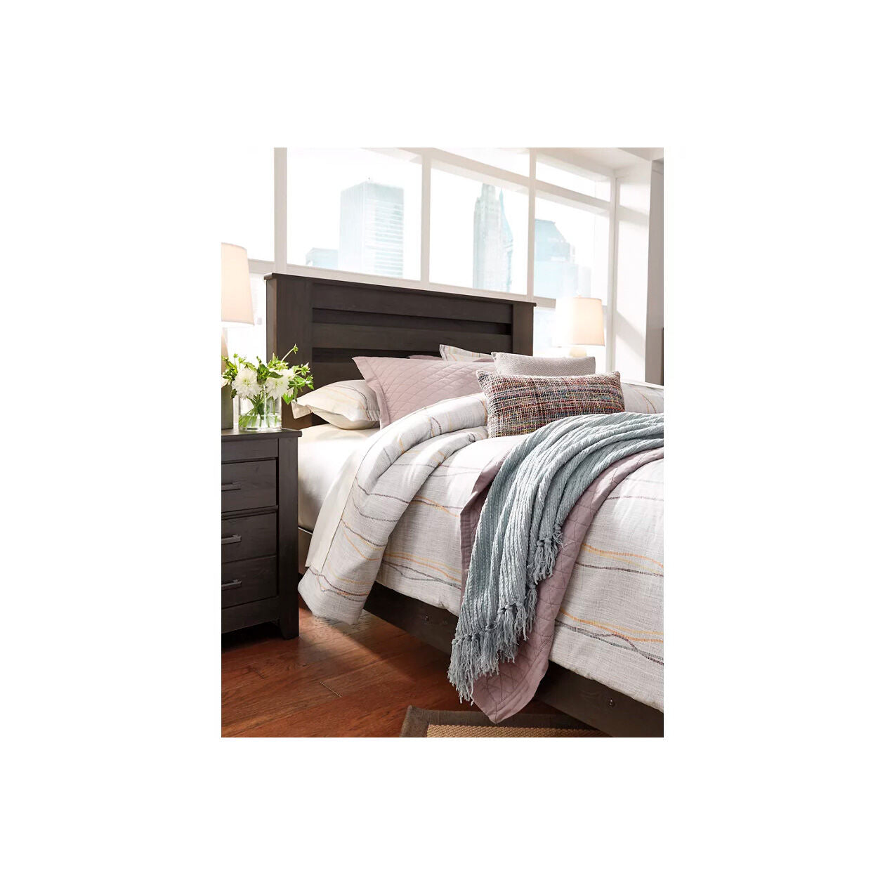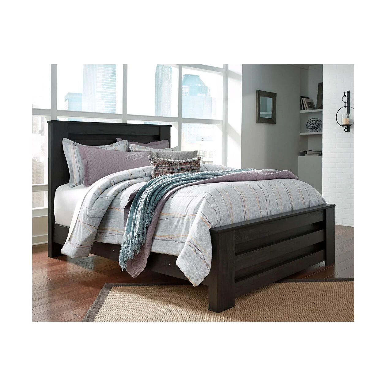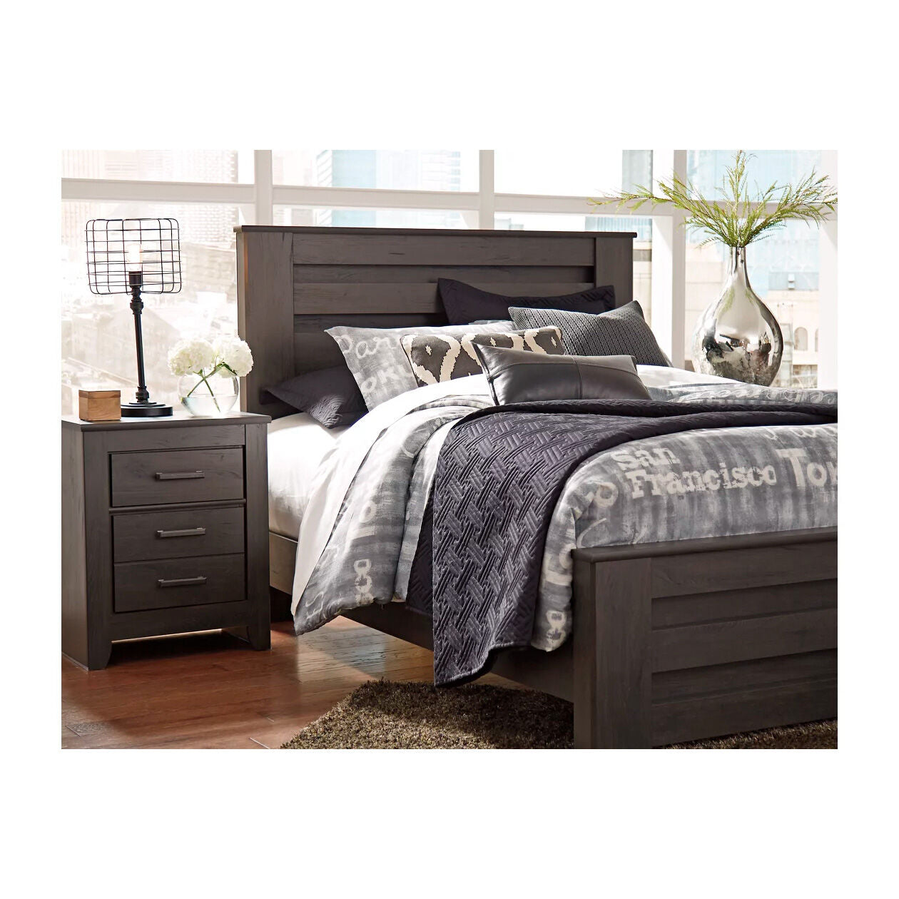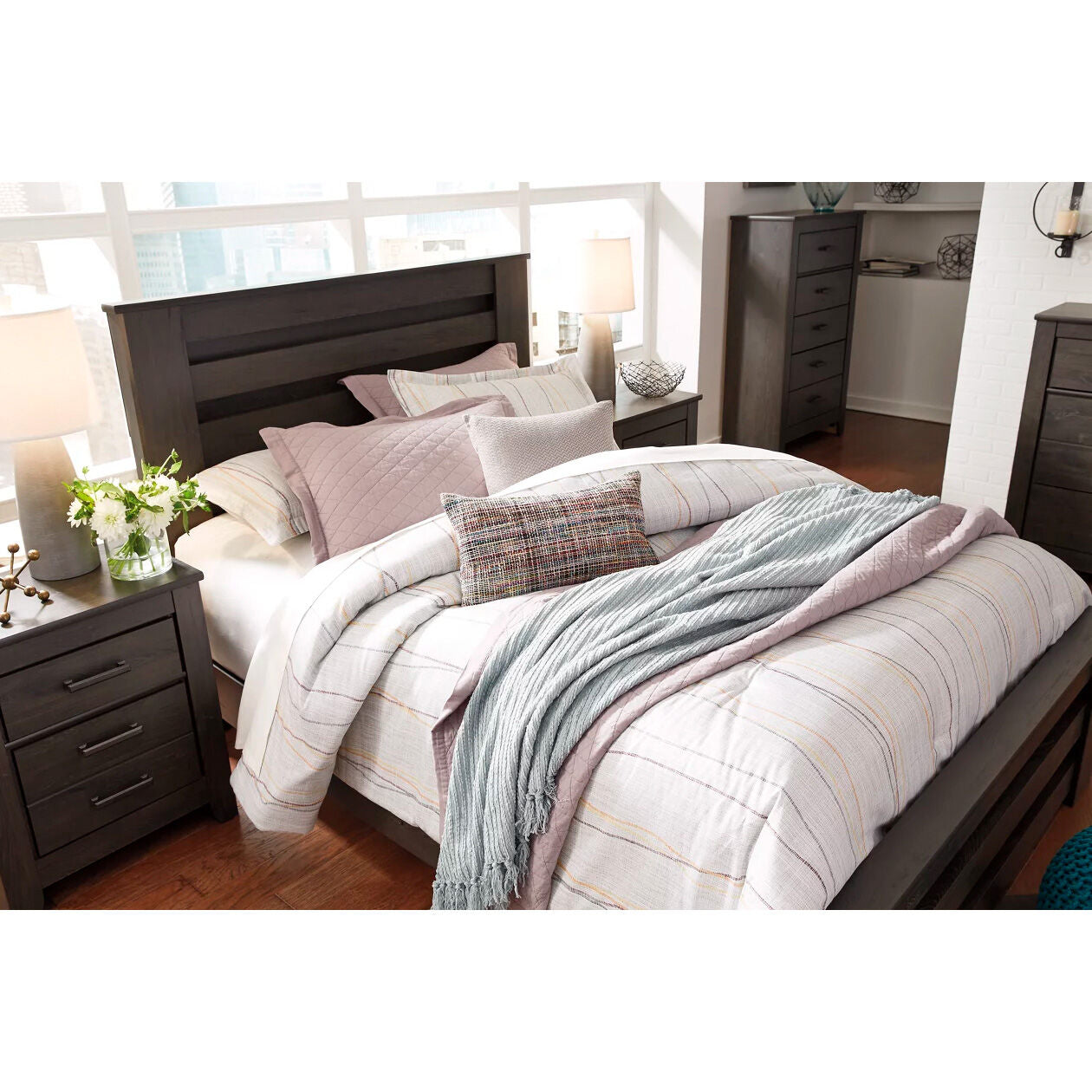 Priced to entice and styled to impress, this alluring king panel bed is urban sophistication with a decidedly relaxed air. It's got the crisp, clean lines of a contemporary piece, but with an earthy element. Deep, horizontal grooves infuse depth and dimension, a replicated oak grain effect gives the charcoal gray finish warmth and character. Mattress and foundation/box spring sold separately.