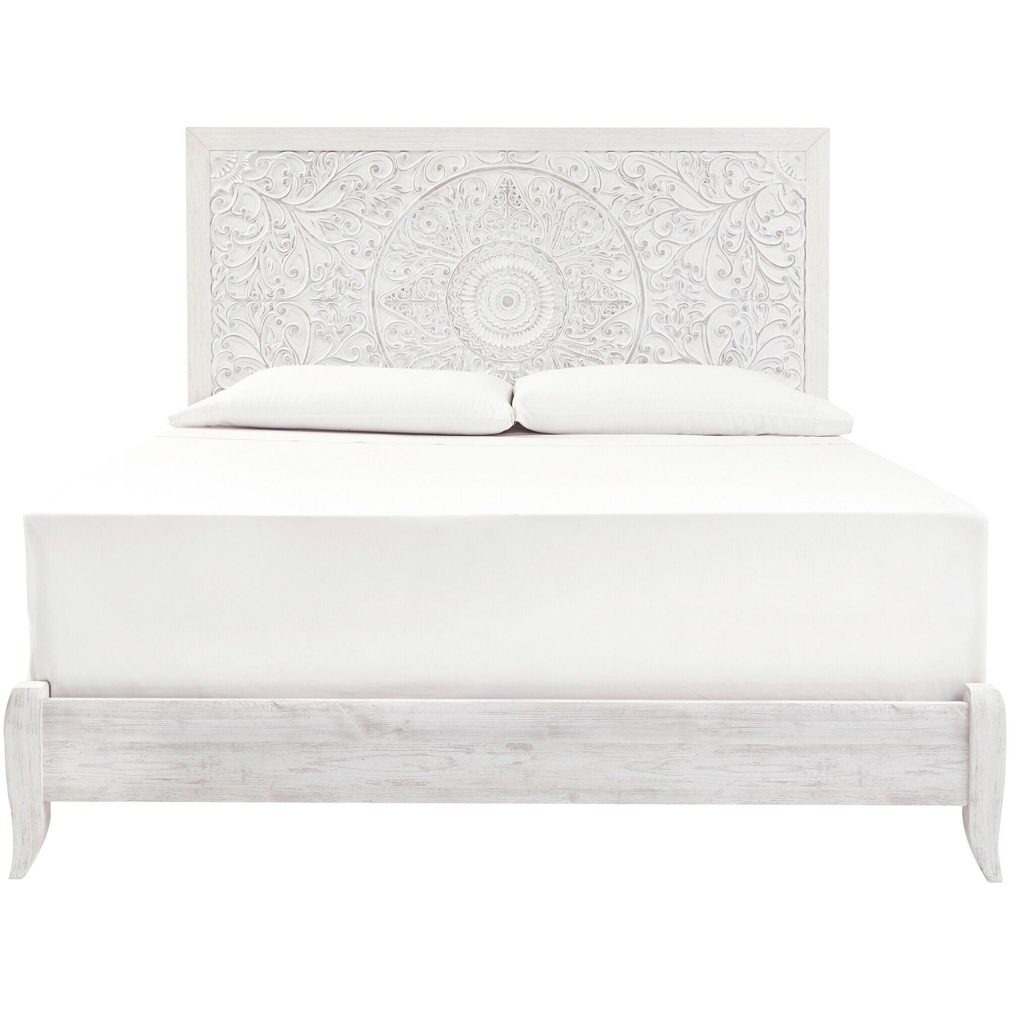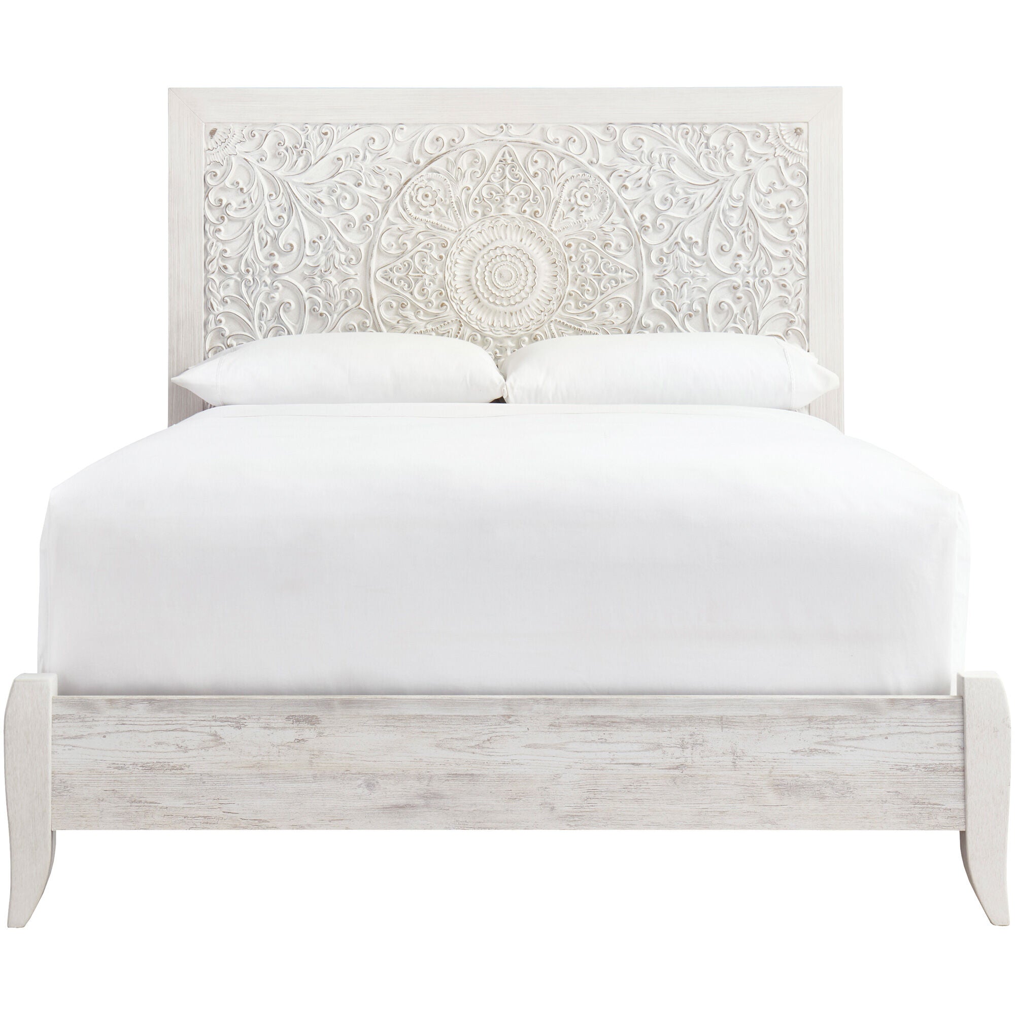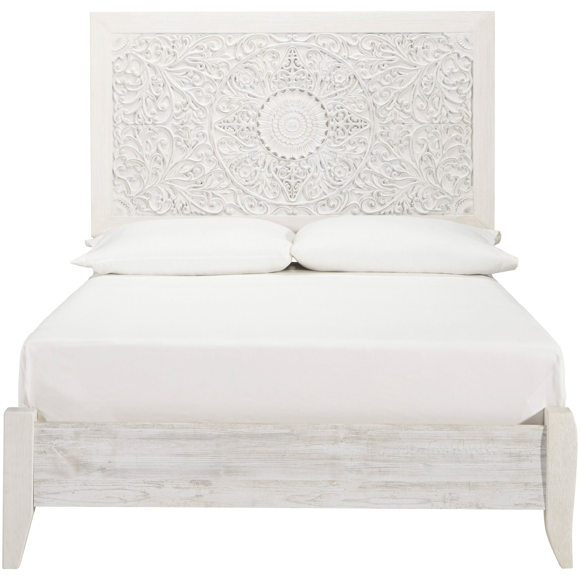 The Paxberry bed brings the spirit of boho chic into the bedroom. This carved medallion pattern on the headboard is intricate yet easygoing, with a timeless sensibility that never goes out of style. And the whitewash finish has a casual, hand-applied look. This panel bed makes a great focal point for the Paxberry collection, or your own cottage-style furnishings. Made of engineered wood and veneers, it adjusts to your choice of four heights.