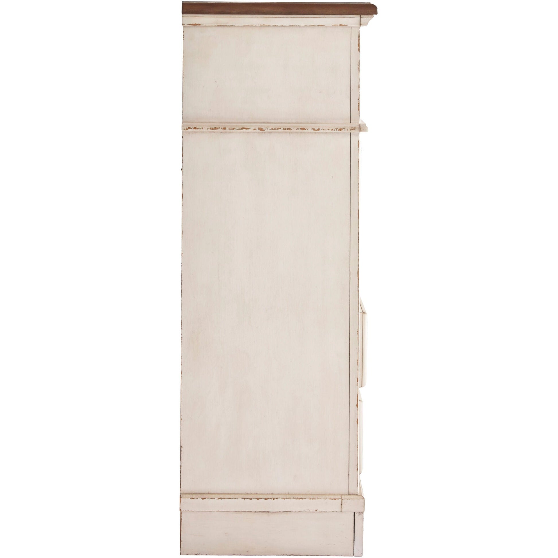 The Realyn chest keeps the look of French provincial going strong. With its distressed detailing, this 5 drawer bedroom chest has an antiqued look that epitomizes shabby chic. All the classic elements are in place: framed drawer fronts, decorative corbels, and bronzed bail drawer pulls. Quality construction details include dovetail drawer construction with smooth, ball bearing glides. Realyn is made of veneers, wood, and engineered wood.