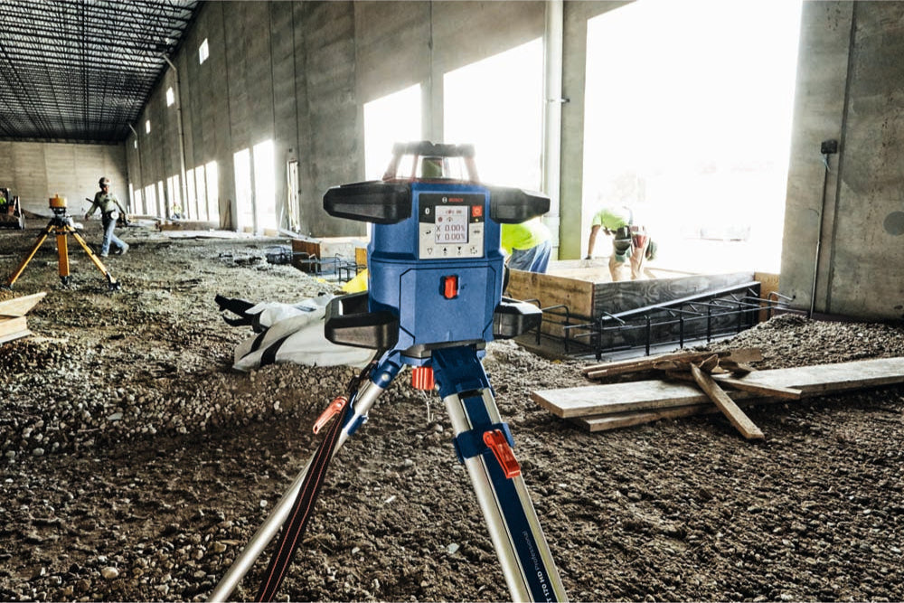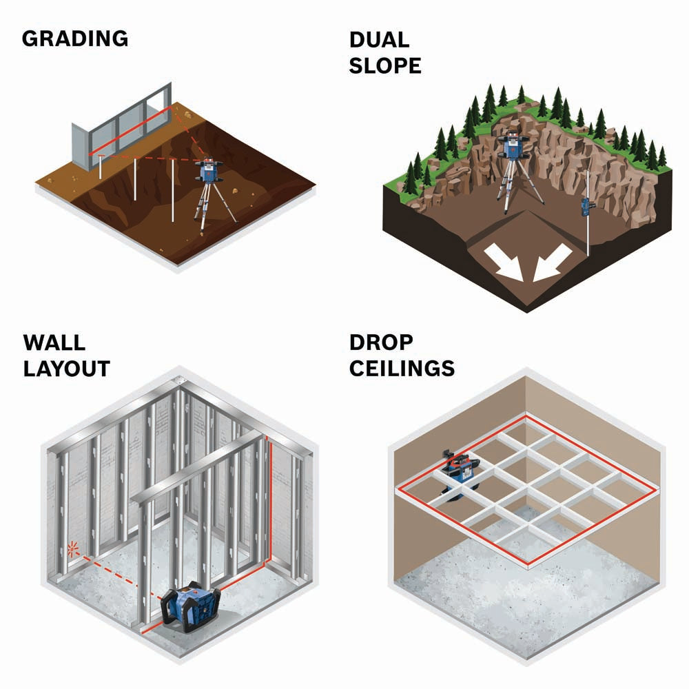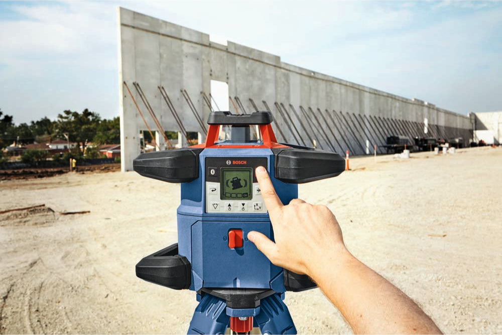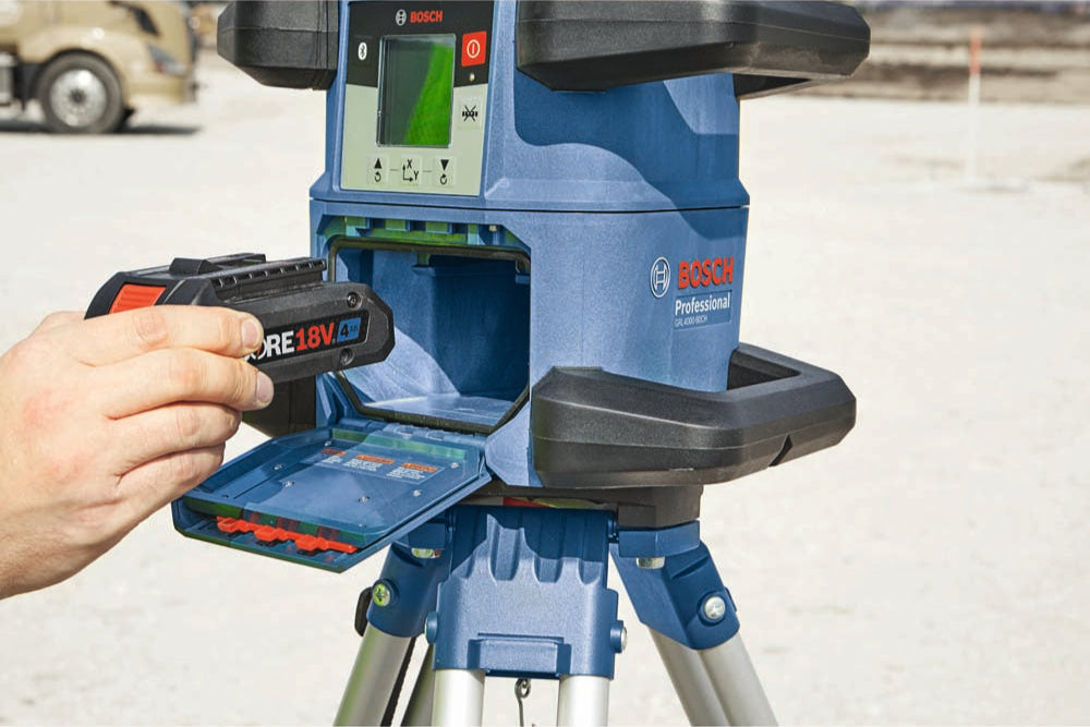 The 18V REVOLVE4000 Connected Self-Leveling Horizontal/Vertical Rotary Laser Kit with uCAL User-calibration delivers a comprehensive solution for precise outdoor and indoor leveling. It has a Dual Dial-In Slope feature that allows slope angle adjustment on both the X and Y axes, for grading applications. This laser is powered by a Bosch CORE18V 4.0 Ah battery, providing extended runtime. The rotary laser is compatible with 4.0 Ah and 8.0 Ah Bosch CORE18V Li-ion batteries. It also features an alkaline adapter to use four (D) cells. The REVOLVE4000 is engineered with a cage overmold and an innovative handle design, and it is built to IP68 dust- and water-protection standards. It features Bluetooth® connectivity to a connected device, linking to the Bosch Leveling Remote App. This app controls on/off, Dual Dial-In Slope, and more. The rotary laser features uCAL, for user-calibration, taking the user step by step through the calibration process. This avoids tool down time and provides confidence that the laser is accurate. It delivers accuracy of up to ±1/16 In. at 100 Ft. in horizontal applications and ±1/8 In. at 100 Ft. in vertical mode, and a range of up to 4,000 Ft. with laser receiver. The laser features a vertical beam at 90° point for layout, squaring and plumb applications. The comprehensive kit includes a remote control, 18V 4.0 Ah battery and charger, alkaline battery adapter, wall mount, laser receiver, aluminum tripod, sturdy grade rod and durable hard carrying case.