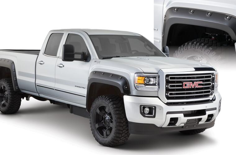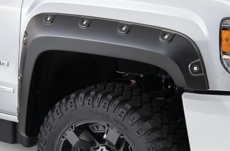 With their recessed stainless steel bolts and massive presence, Pocket Style® Fender Flares are a Bushwacker original and an off-road icon. They're custom-designed for your GMC Sierra to complement oversized tires and high-clearance lift kits. You can mount them right out of the box, with their tough, OEM-style matte black finish - they're UV protected so they won't chalk. Or, paint them to match or accent the body color, for a factory-custom look. Pocket Style® Fender Flares are made in the USA from our thick, warp-resistant Dura-Flex® 2000 material, tailor-made for added durability and flexibility on the trail. Despite their hard-core bolt-on styling, Pocket Style® Fender Flares install easily, with minimal drilling required. When you need maximum tire coverage with minimum time and effort, it's in the pocket. Pocket Style® Fender Flares from Bushwacker.