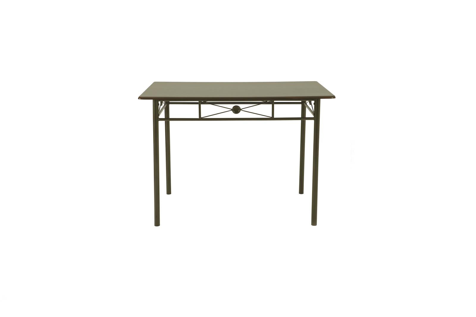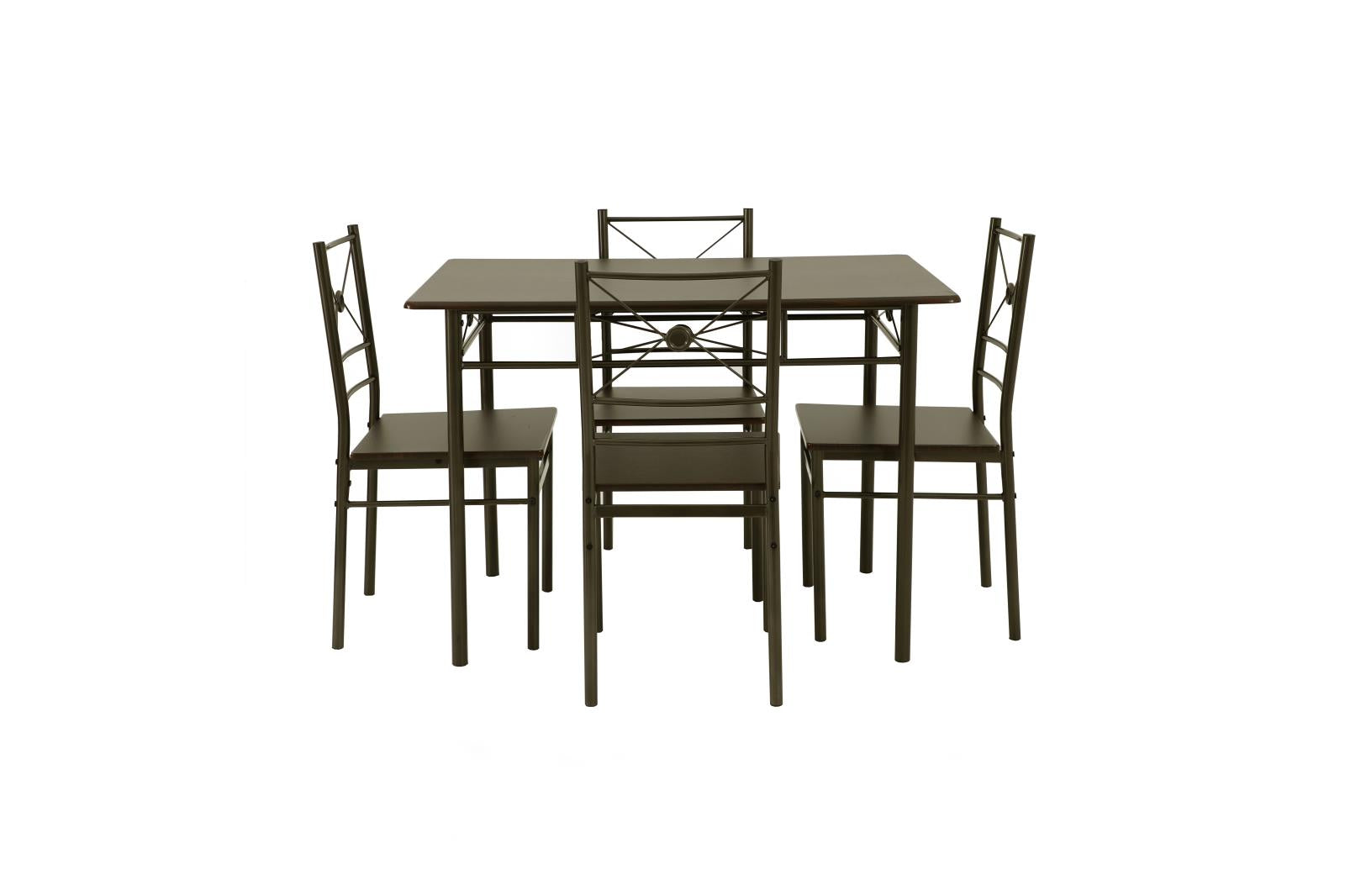 This stunning five-piece dinette set is as fashionable as it is functional. With seating for up to four, it's perfect for an eat-in kitchen or breakfast nook. Its beautiful dark bronze finish is enhanced by an eye-catching crisscross design and artistic circular accents. A vinyl-topped table and seats allow for easy cleaning, while a base of metal tubing provides strength and durability. This lovely dining set is ideal for grabbing a quick bite before heading to work, or for sitting down to enjoy a leisurely meal with the whole family.