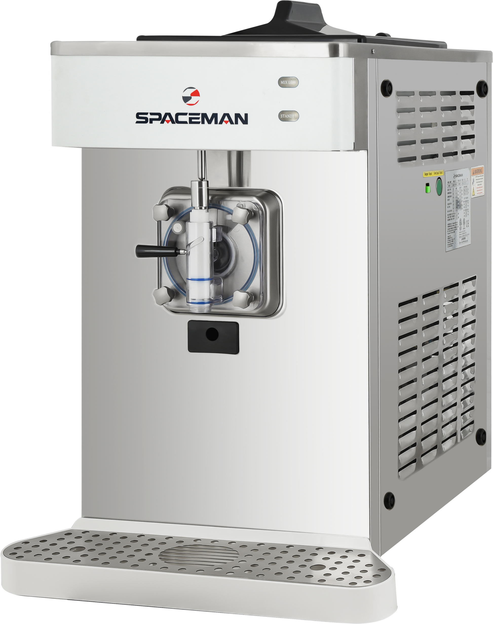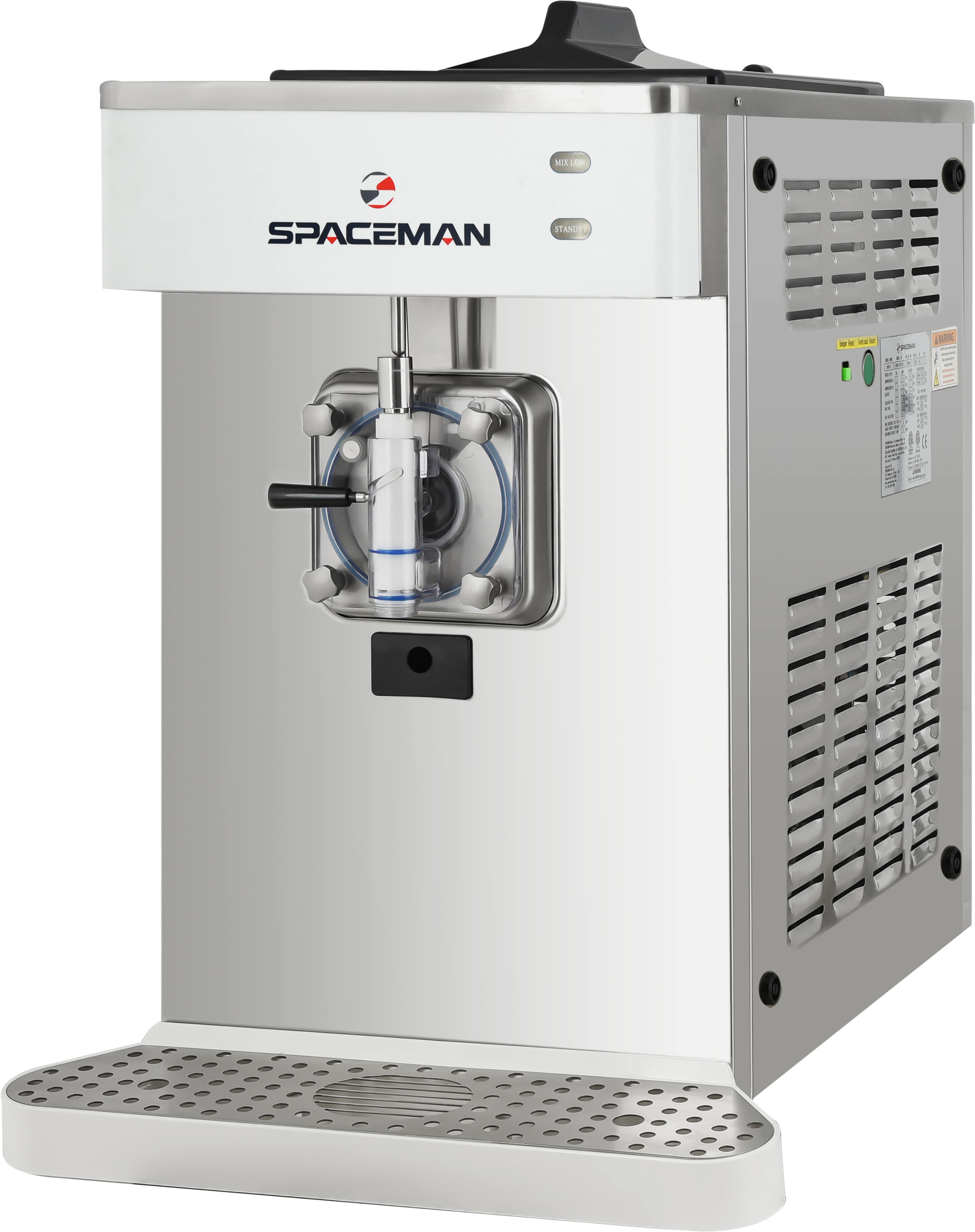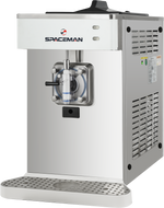 The 6690-C is a high-volume countertop single flavor frozen beverage machine. Ideal for busy operations servings frozen drinks, milkshakes, and cocktails. Patented freezing technology makes for quick freeze and recovery times, is more efficient, and uses less energy per serving then competitors. Pre-cooling in the hopper refrigerates product before entering the freezing cylinder, further improving the freeze down time ' it also means this model carries food safety approval for storing product overnight, including dairy. Spaceman' s patented freeze technology combined with the all new V2 beater/blade system means easy cleaning and the best product consistency available. The Spaceman V2 system scrapes the cylinder walls with precision, resulting in smaller ice crystals. The design ensures smooth icy cold product sure to tantalize and please your senses! The new C overhead design allows you to switch products and hardness levels in under 30 seconds. Multi-unit operators can choose a 1-6 setting based on product and control consistency easily across locations. Our low evaporator temperature allows Spaceman frozen beverage machines to freeze alcoholic beverages with ease! High volume operations can reply on the 6690-C to serve milkshakes, smoothies, frozen coffee drinks, margaritas, or other frozen cocktails. Patented freezing technology makes for a fast recovery time in the 7.3qt cylinder, producing 90 quarts per hour, or 360 x 8oz drinks.