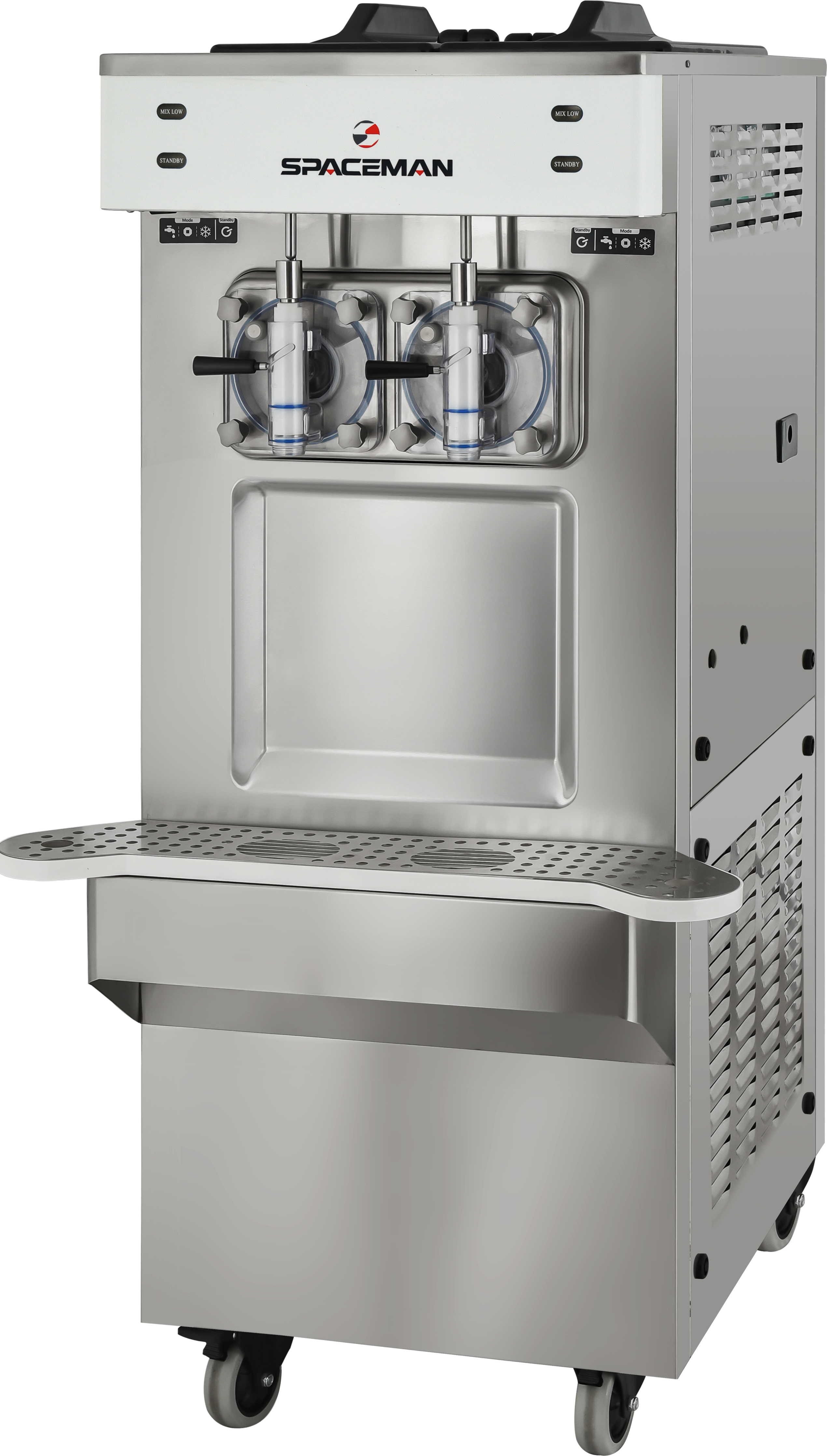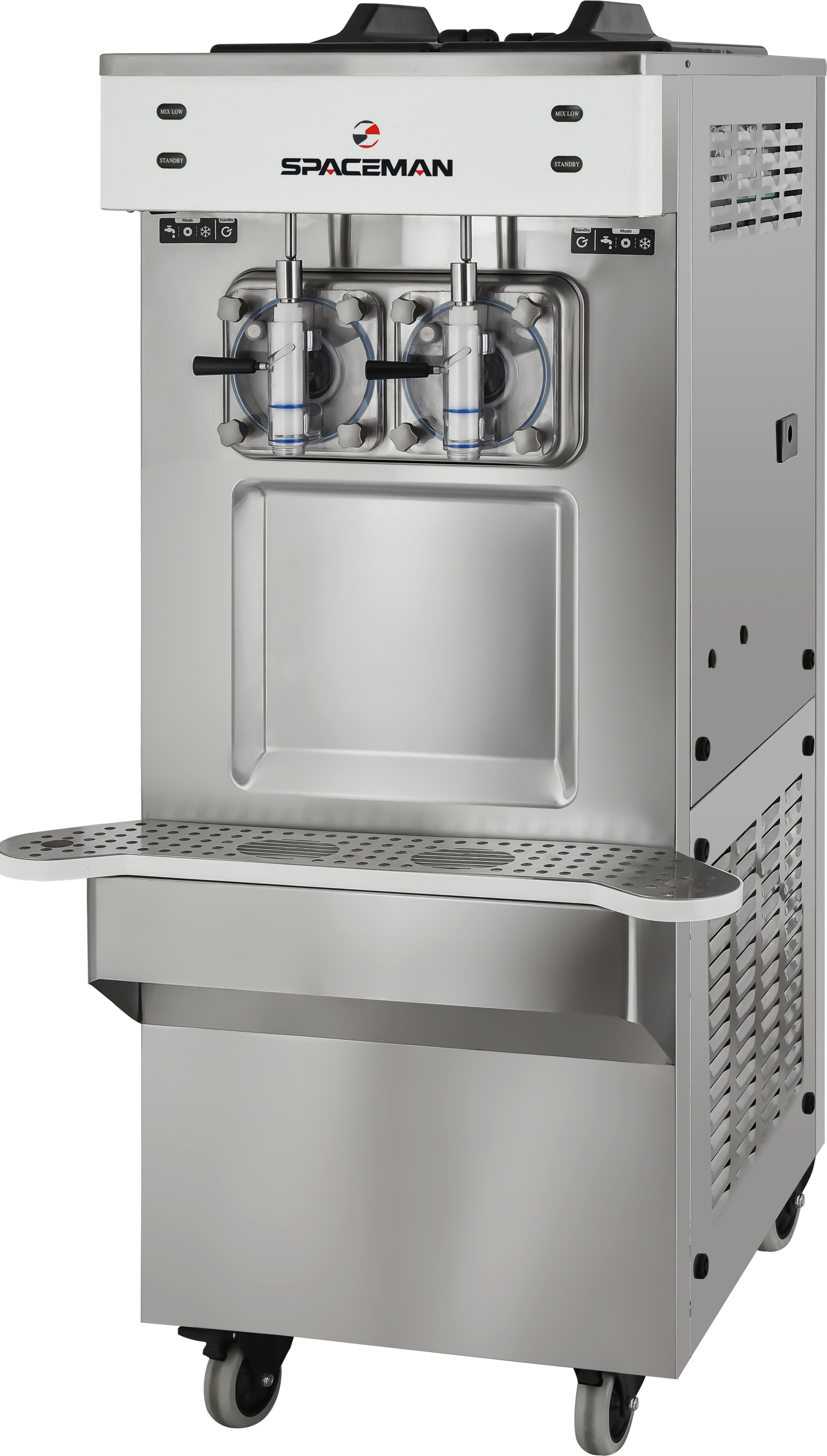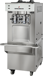 The 6795-C is a two-flavor countertop frozen beverage machine great for ultra-high-volume applications. Patented freezing technology makes for quick freeze and recovery times, is more efficient, and uses less energy per serving then competitors. Dual controls allow the operator to serve different products from either side of the machine, varying the menu with options like shakes, smoothies, frozen coffee drinks, margaritas, or other frozen cocktails. Pre-cooling in the hopper refrigerates product before entering the freezing cylinder, further improving the freeze down time ' it also means this model carries food safety approval for storing product overnight, including dairy. Spaceman' s patented freeze technology combined with the all new V2 beater/blade system means easy cleaning and the best product consistency available. The Spaceman V2 system scrapes the cylinder walls with precision, resulting in smaller ice crystals. The design ensures smooth icy cold product sure to tantalize and please your senses! The new C overhead design allows you to switch products and hardness levels in under 30 seconds. Multi-unit operators can choose a 1-6 setting based on product and control consistency easily across locations. Our low evaporator temperature allows Spaceman frozen beverage machines to freeze alcoholic beverages with ease! Patented freezing technology makes for a fast recovery time in the 7.3qt cylinder, producing 120 quarts per hour, or 480 x 8oz drinks. The 6795-C comes equipped with four heavy duty rotating and locking caster wheels and an eight foot cord and plug.