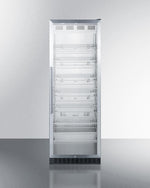 Summit's commercially approved beverage merchandisers are designed for durable service, convenient use, and attractive presentation. The SCR1401 is an upright beverage center conveniently sized with a slim 24 inch footprint. The stainless steel trimmed glass door provides a full view of storage down to the floor, with recessed LED lighting to ensure an attractive and efficient presentation. The door comes in a right hand door swing and features a self-closing design to help protect stored items in commercial settings where customers may not take the time to ensure a tight seal. A factory installed lock offers additional security. This unit has a front-breathing cooling system that allows built-in installation, and a fully finished exterior that also enables freestanding use. Inside, the SCR1401 utilizes frost-free operation for minimum user maintenance. The interior walls are made from stainless steel for improved durability and sanitation. The cantilevered shelving system allows you to easily adjust your storage to accommodate virtually any size. The digital control panel is conveniently located towards the top, allowing staff to adjust the temperature without bending to the floor. The readout can be viewed in Celsius or Fahrenheit. Additional features include an audible high temperature alarm, open door alarm, temperature memory function, and sabbath mode setting. The SCR1401 is ETL-S listed to NSF-7 standards for use in commercial settings. Similar choices are available in lower heights for more space-challenged areas. Browse Summit's commercial product line for more.