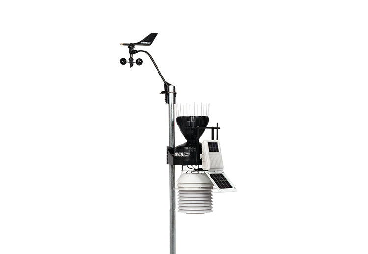 The Vantage Pro2 GroWeather wireless weather station is an agriculture-focused weather station that includes all the features of Vantage Pro2, plus a solar radiation sensor for evapotranspiration measurement. The Vantage Pro2 GroWeather provides accurate, reliable weather monitoring with real-time data updates every 2.5 seconds. It features an industry-leading transmission range of 1,000'/300 m from the sensor suite to an optional WeatherLink Console or EnviroMonitor IP Gateway. The sensor suite's outside temperature and humidity sensors are housed in a 24-hour fan-aspirated radiation shield for maximum accuracy.