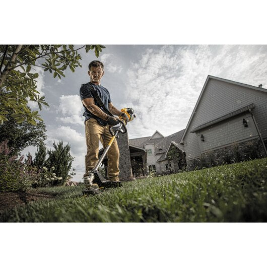 The DEWALT 2-Cycle Straight Shaft String Trimmer provides power and durability with a gas, full-crank engine to power through tough overgrowth. Trim more grass in less time with the large 17 in. cutting swath and efficient easy load bump head for fast re-spooling. It features ergonomic overmold handles for comfort even on the toughest jobs. The attachment capable string trimmer is compatible with the TrimmerPlus system (attachments sold separately).