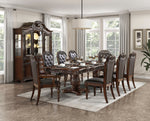 Rich in the aesthetic of Old-World tradition, the design of the Adelina Collection is the culmination of classic accenting that creates an elegant presentation for your dining room. The dark brown faux leather padded seat and back of the arm chair features button-tufting, wood-framed profile, nailhead trim, and intricately detailed front legs and chair back. Furthering the timeless aesthetic that permeates the collection, is the cherry finish, with gold tipping, over birch veneer and pine solids.