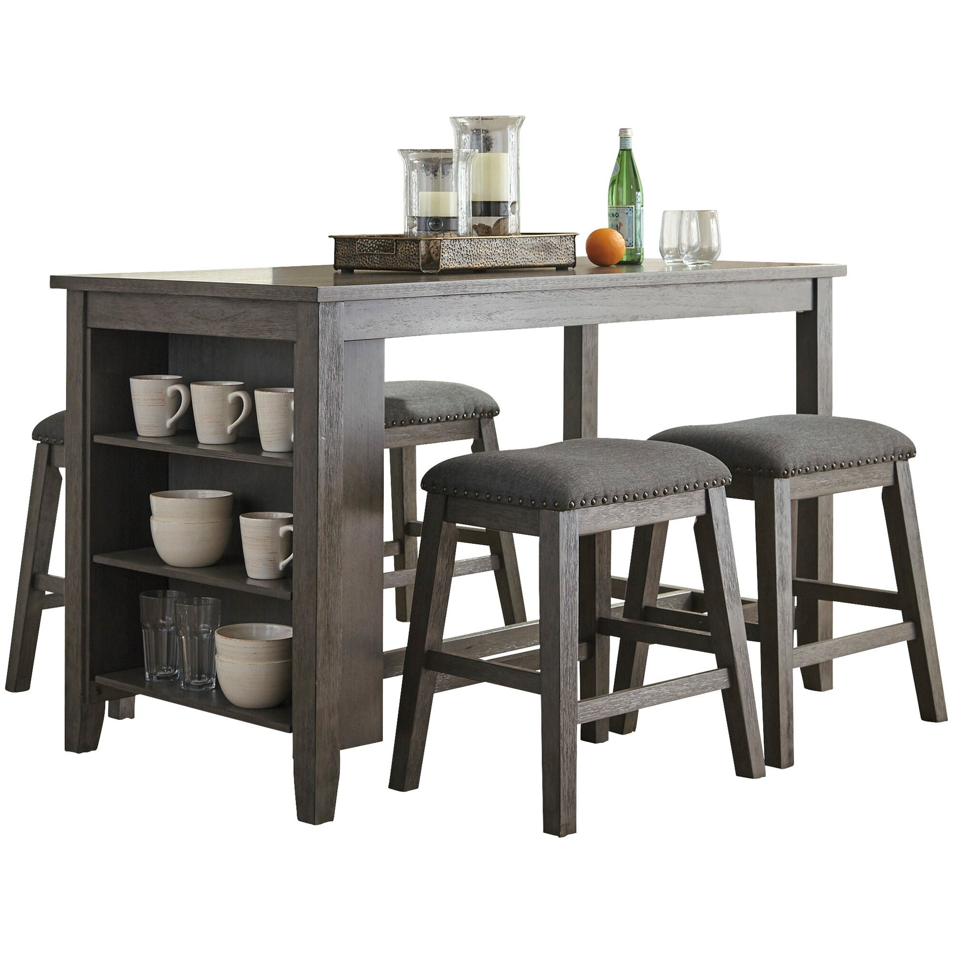 Here's casual elegance at its best: the Caitbrook 5-piece dining set with backless stools. Perfect for any relaxed contemporary or transitional home, the dining table has built-in side shelves to make the most of your storage space. The barstools are nice and wide, with cushioned seats and nailhead trim. Wide legs with stretchers aid stability. This counter height dining table and counter stool set combines acacia veneers, solids, and engineered wood, and features a unique gray wash finish.