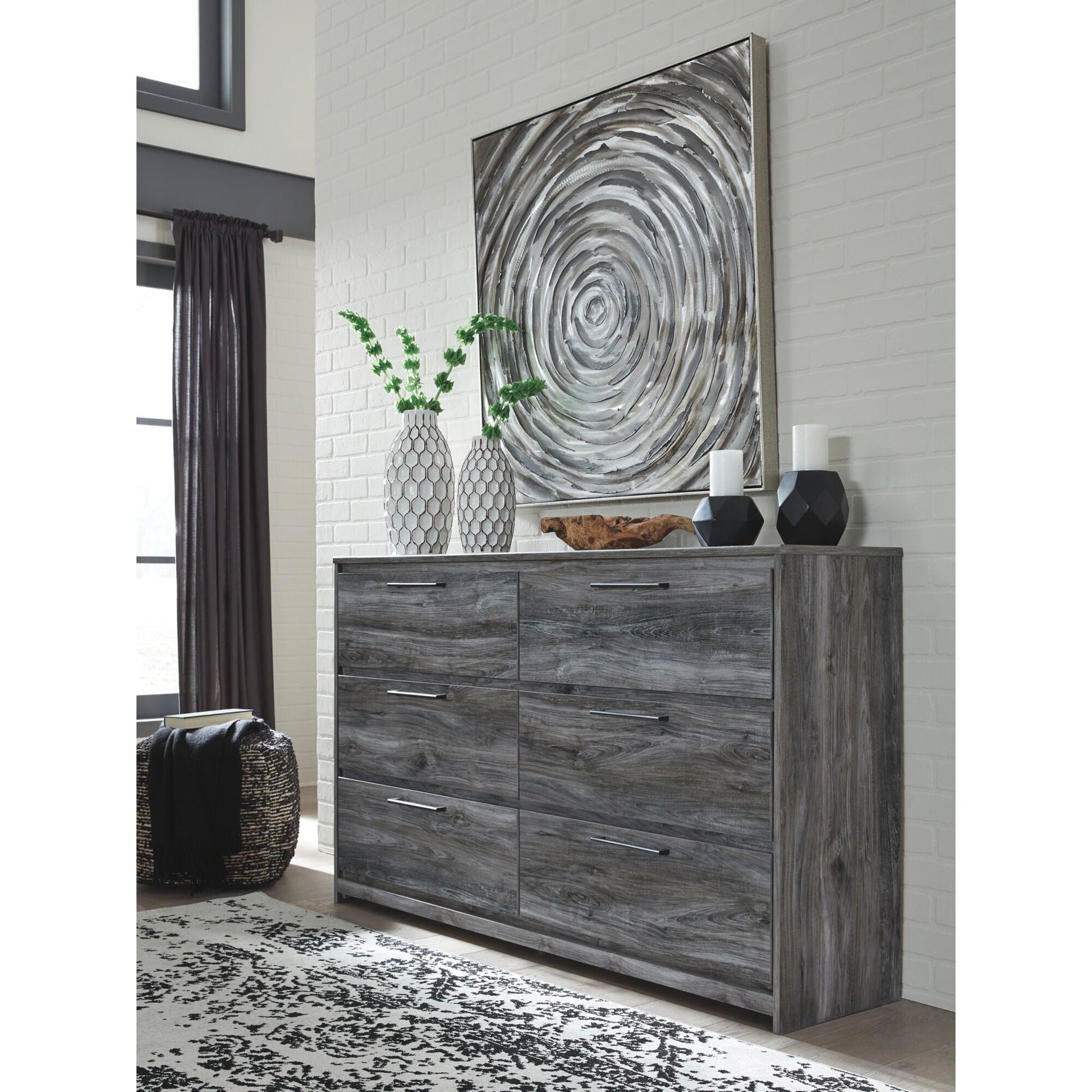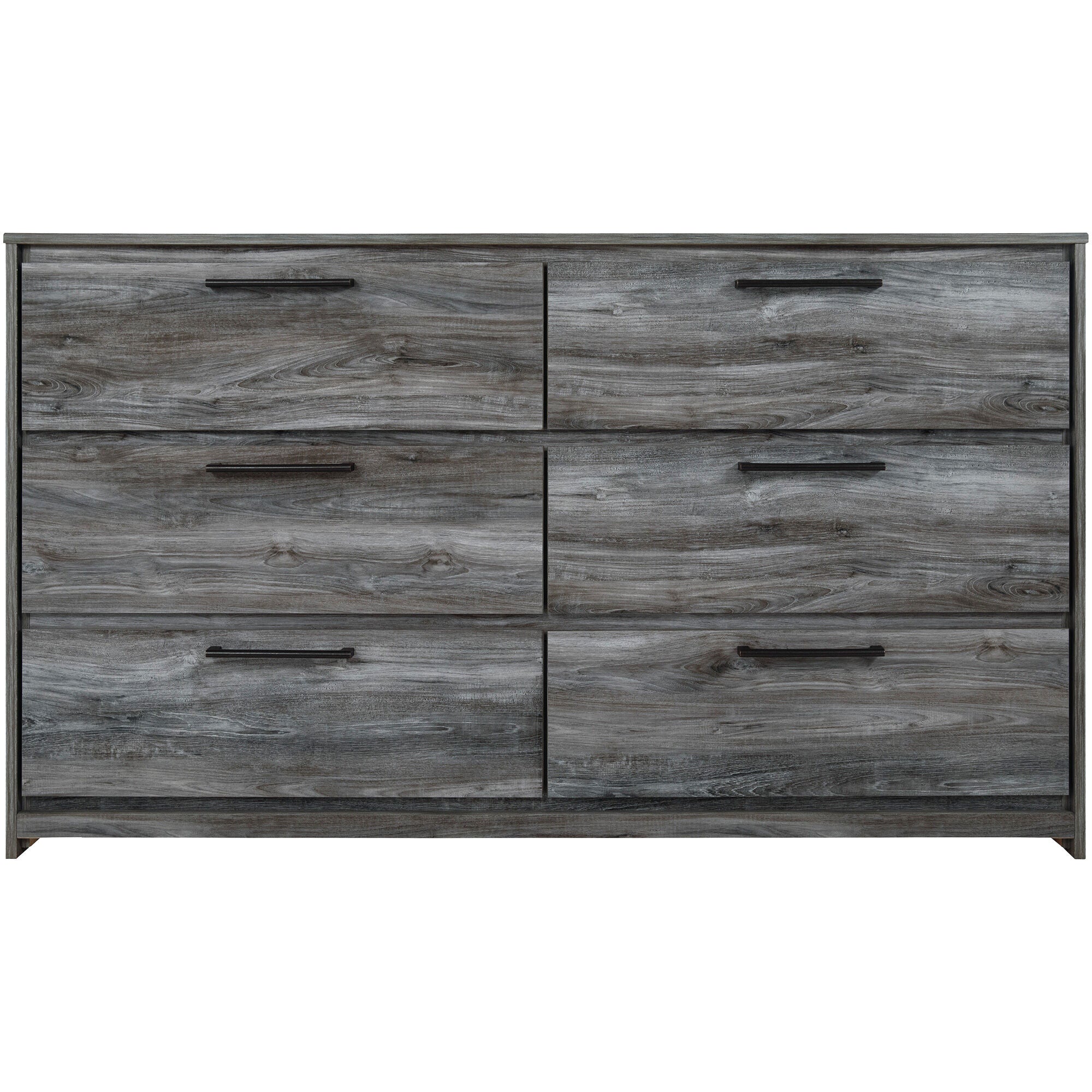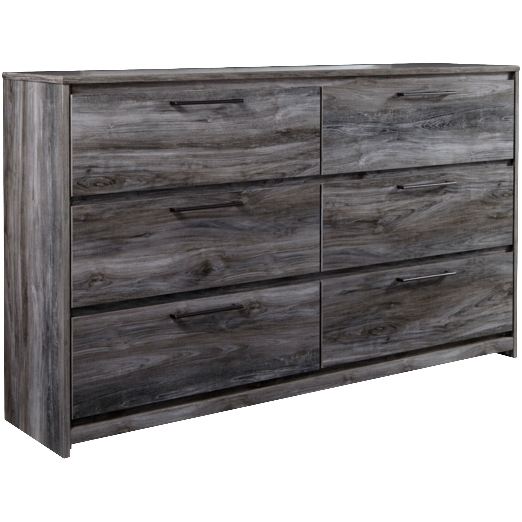 Enjoy the rustic chic of the Baystorm dresser. Its casual, driftwood-inspired look will set the tone for your modern or transitional bedroom. Made of engineered wood, it has a replicated woodgrain look and a smoky finish that's both laid-back and eye-catching. Antiqued gunmetal handles add the perfect finish. Matched with the rest of the Baystorm collection or your own pieces, this roomy, 6-drawer chest is a must for setting a relaxing tone in your bedroom.
