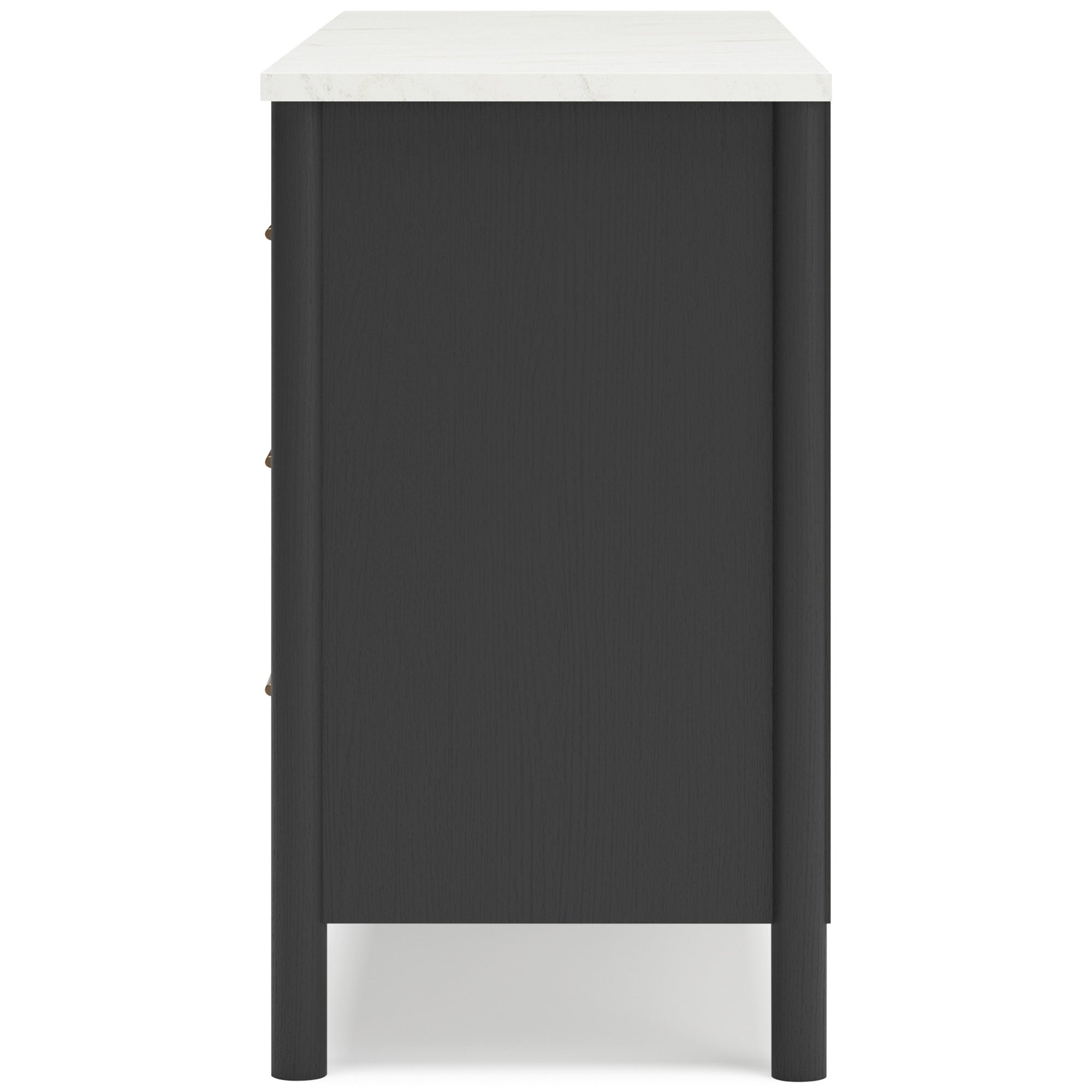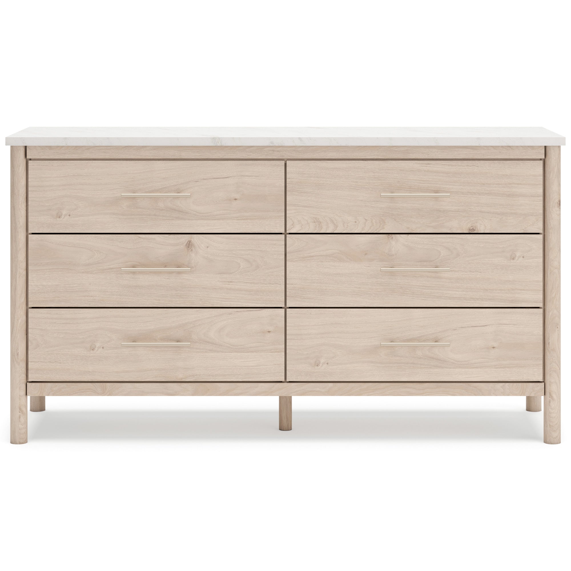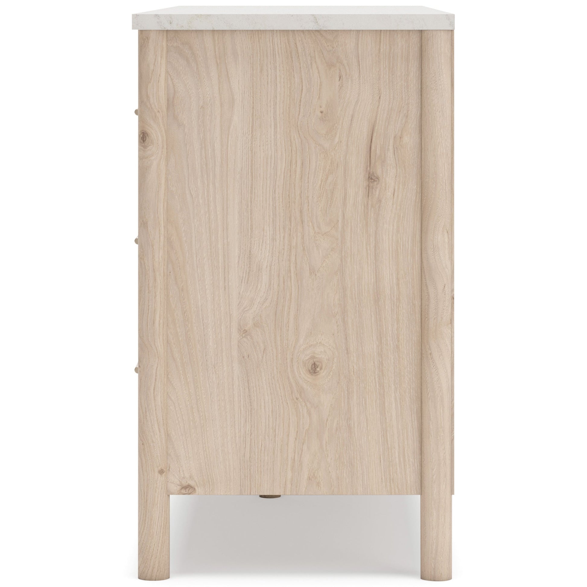A casual contemporary design with a smooth, light finish and white marble top. 6 Drawers feature smooth side roller glides and champagne colored finished handles. - Product Details provided by Manufacturer, Slumberland not responsible for errors in information.
