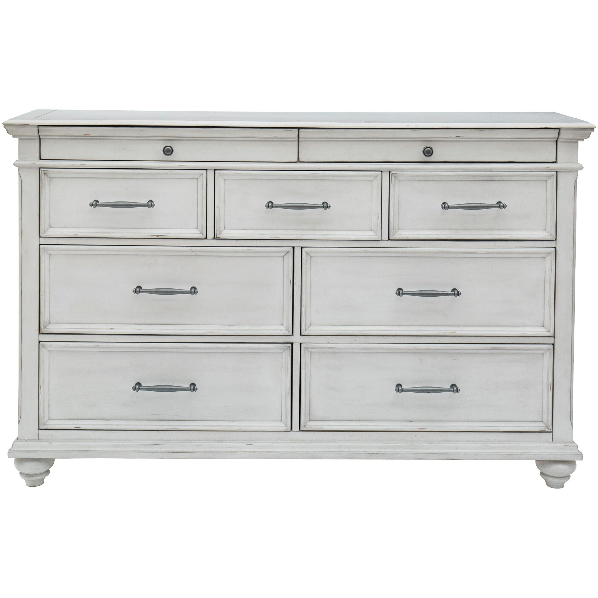 Give your retreat vintage charm and valuable drawer storage with this dresser. In a beautifully distressed whitewashed finish, you'll love putting it all away in casual style. Seven full-sized drawers and two accessory top drawers will easily accommodate your needs. Generously scaled moulding from top to bottom, along with bun feet and drawer handles with a transitional aesthetic, give this dresser characterƒ??invoking the feel of a quaint cottage escape. - Product Details provided by Manufacturer, Slumberland not responsible for errors in information.