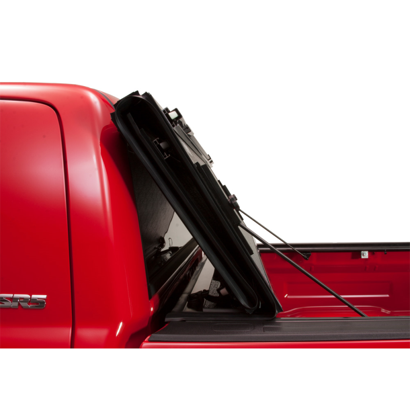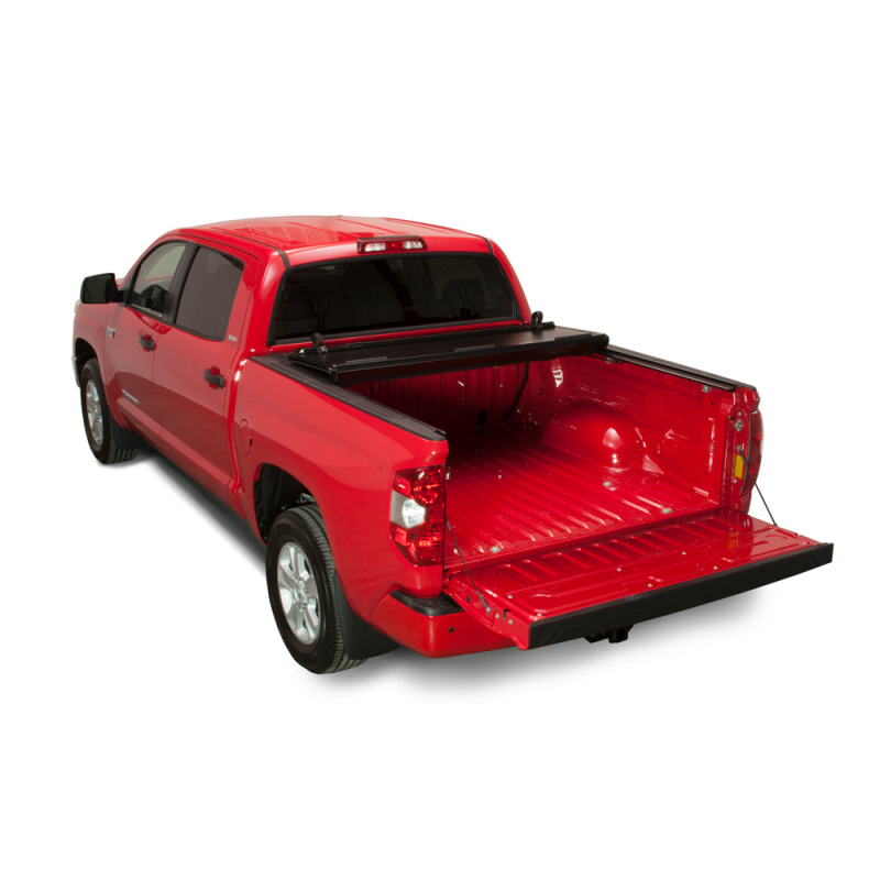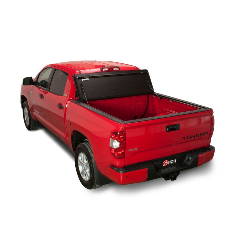 BAK BAKFlip FiberMax Hard Folding Truck Bed Cover - Rail Mounts Near Top of Bed Rail - Rails Can Be Lowered Using Drop Down Brackets - 2022-2024 Toyota Tundra 5' 7" Bed with or without Deck Rail System w/out Trail Special Edition Storage Boxes Model 1126440