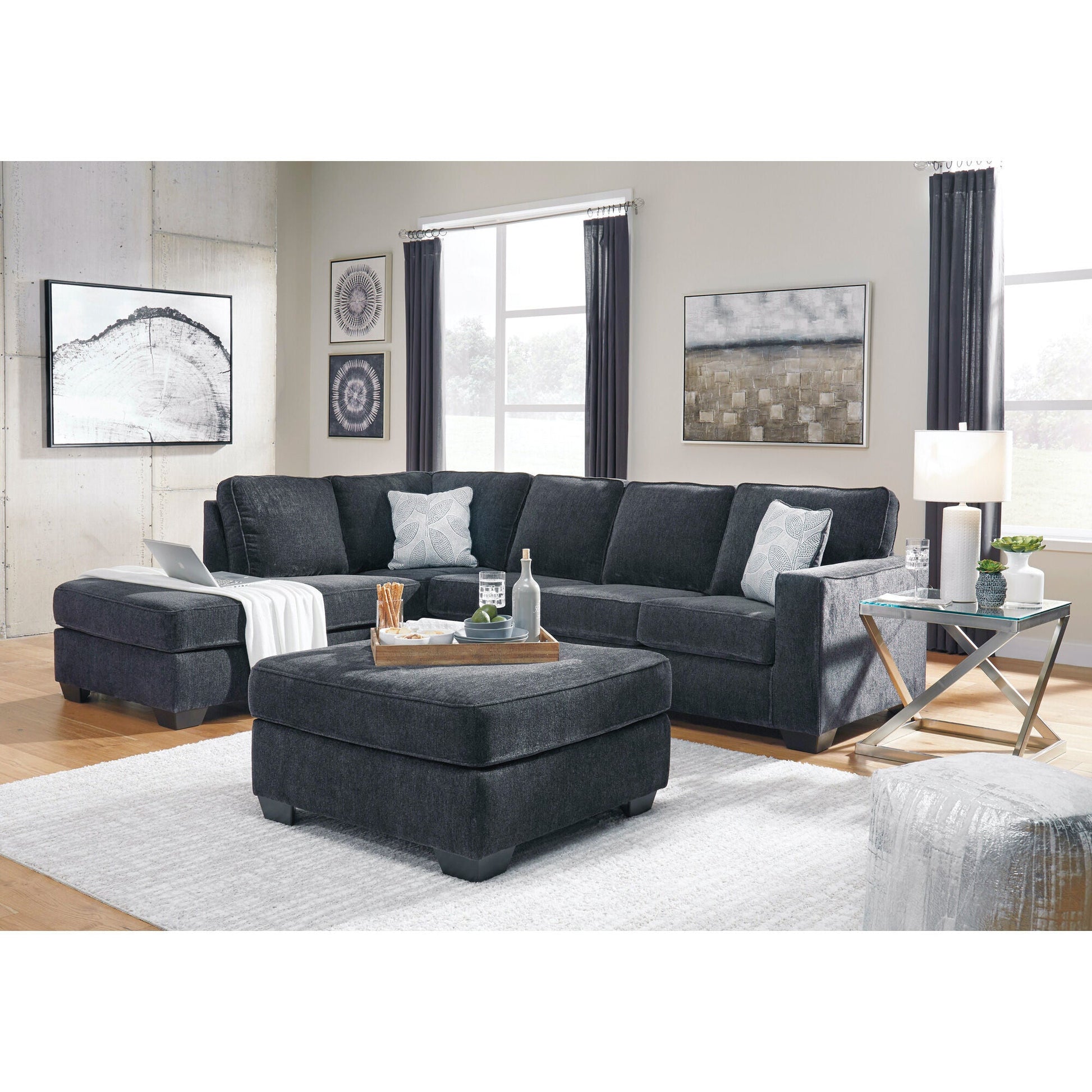 The Riles left chaise sectional brings simplicity and versatility into your home. As casual or as formal as you care to make it, this contemporary sectional in interesting neutral tones blends beautifully with any contemporary or transitional decor. The chaise makes it easy to stretch out and relax. Quality construction features include a corner-blocked frame, high-resiliency foam cushions wrapped in thick poly fiber, and exposed wood feet with a faux wood finish. Two throw pillows with soft polyfil are included.