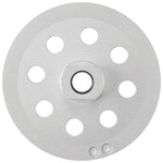 The Bosch Turbo Diamond Cup Wheel provides controlled material removal and a smooth final grind for concrete. Holes in the steel body were added to aid dust control. The wheel itself is precision balanced for less vibration and a better grind. The wheel is more durable than bonded abrasive wheels for concrete and masonry applications, and it can be used for wet or dry grinding. It features a spin-on thread interfaces for toolless mounting to an angle grinder.