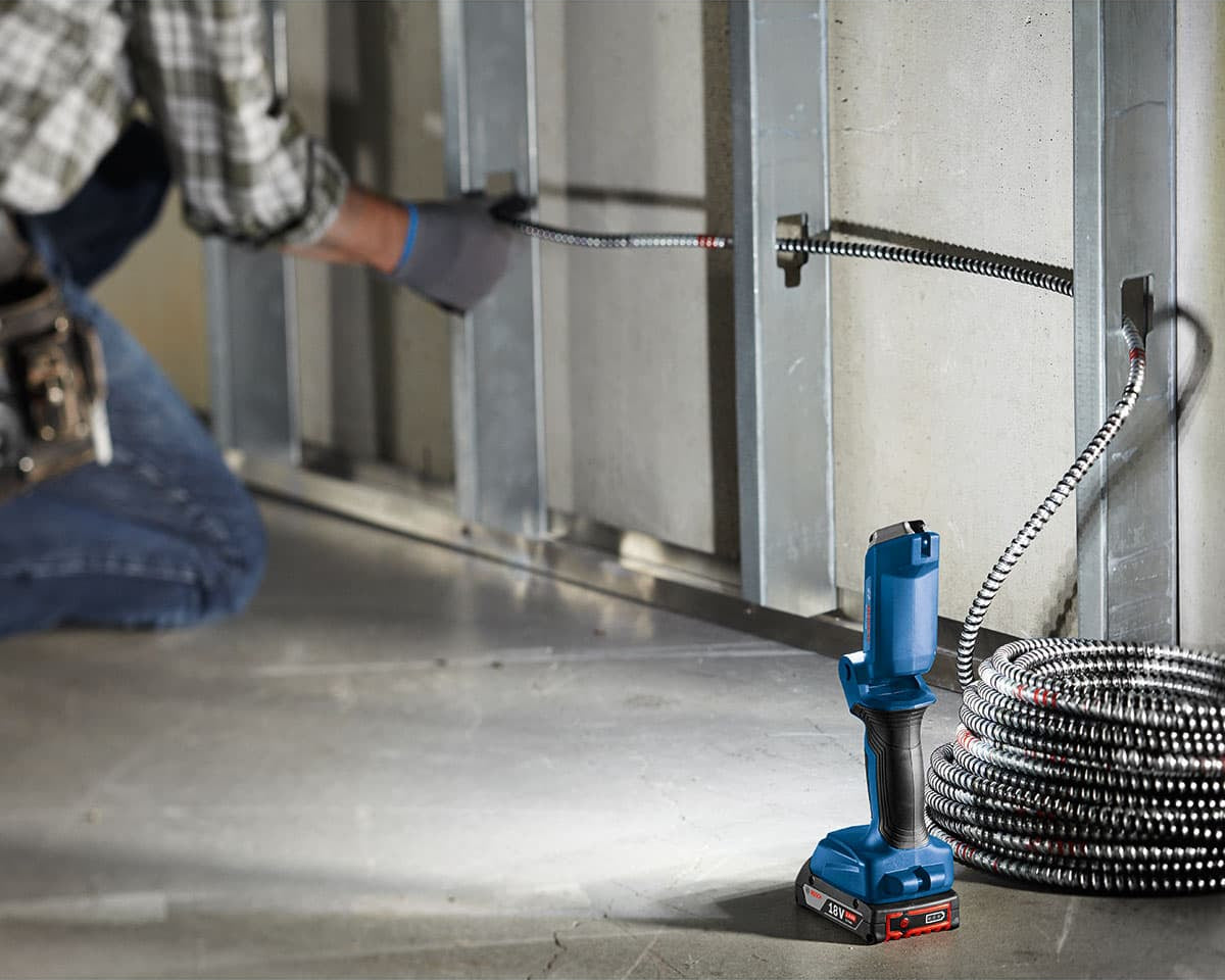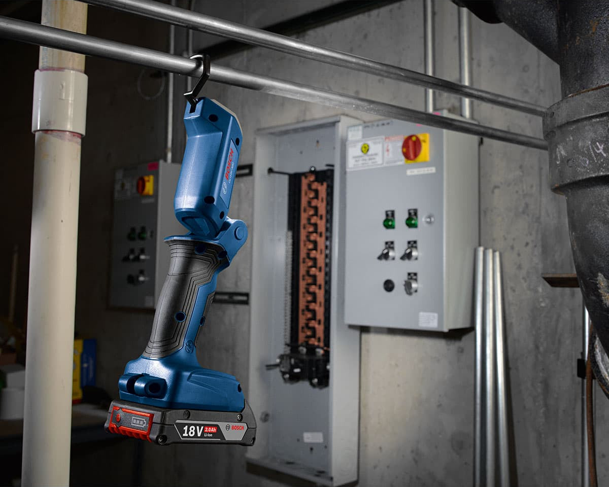 The Bosch GLI18V-300N 18 V articulating LED worklight is a compact, lightweight and bright cordless light. It provides 10 hours of illumination with a 2.0 Ah SlimPack battery (not included) for example – delivering 300 minutes of runtime for every Amp hour (Ah) that the Bosch 18 V battery provides. This flexible worklight lights up a large work area, and it keeps the area lit for hours. The 300-lumen is bright, and it can illuminate a dark work corner. It weighs less than 11 Oz. (tool only, not including battery). The light folds for easy positioning and compact transportation, provides a hook for easy hanging and features six LEDs for bright 300-lumen illumination. This is a bare tool; battery and charger are sold separately.