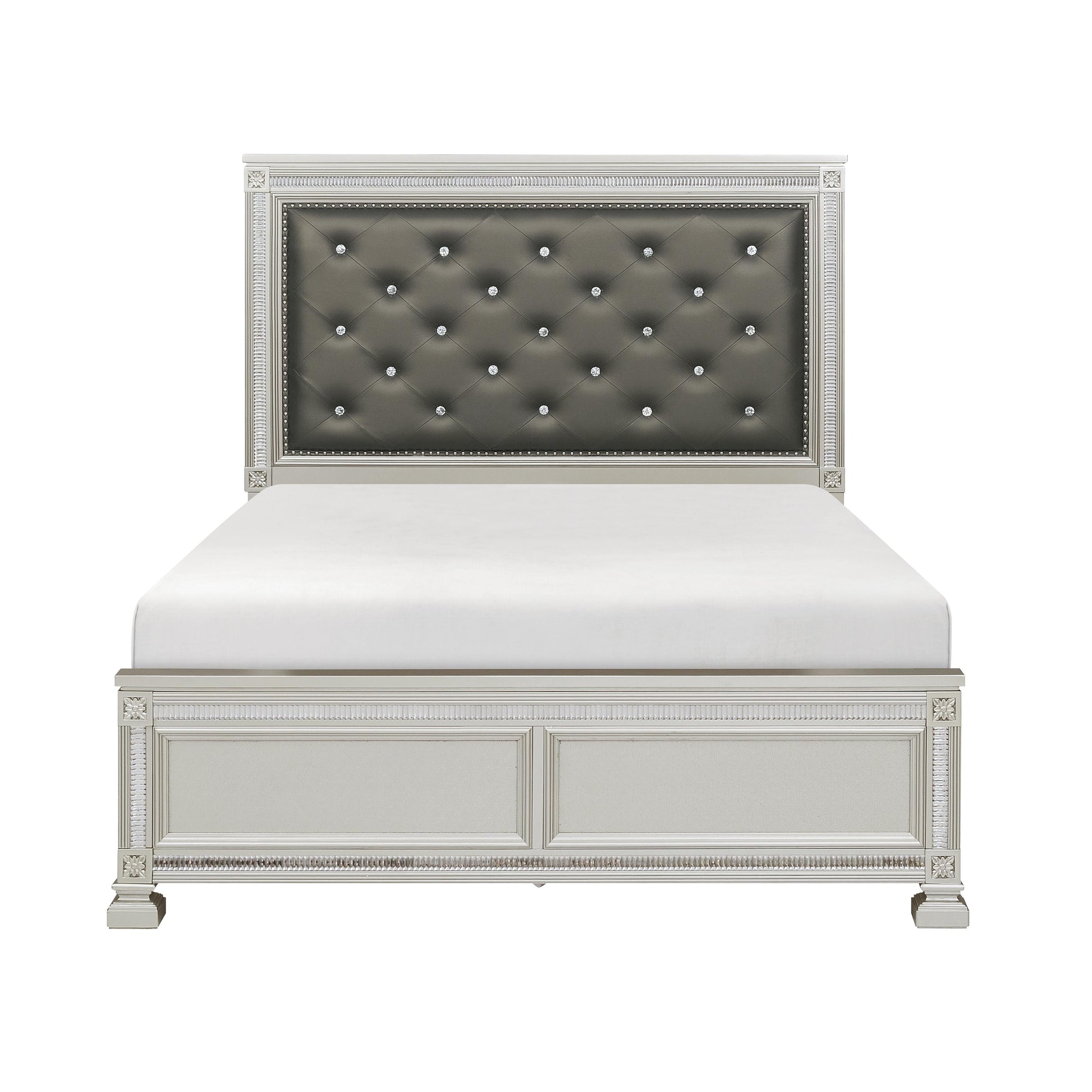 Modern glamour is exemplified in the design of the Bevelle Collection. Acrylic crystals frame the Queen bed, reflecting the light to create eye-catching drama. The silver finish serves as the perfect complement to the medallion accents. Providing contrast to finish is the dark gray faux leather, button-tufted headboard panel.