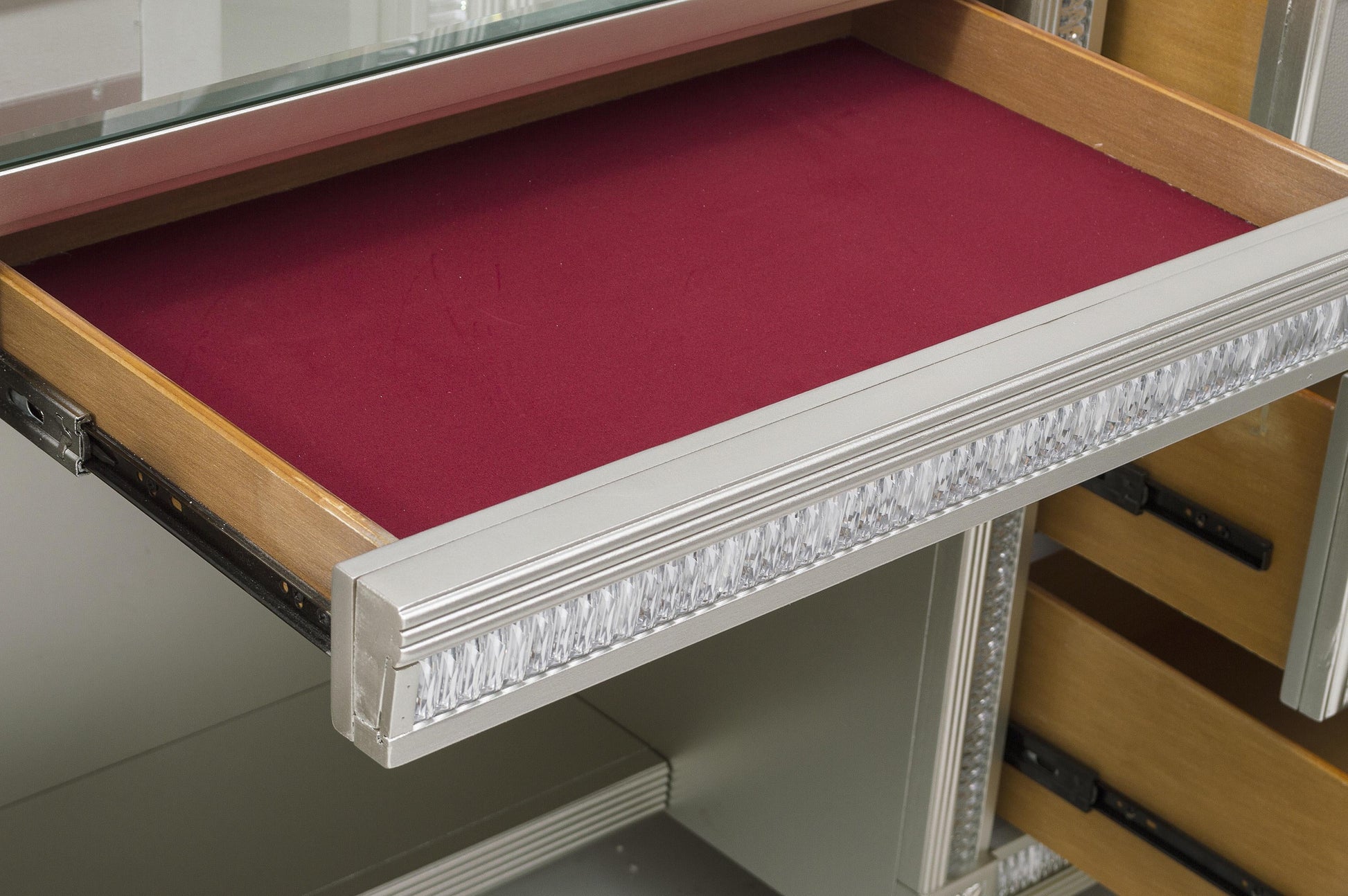 Modern glamour is exemplified in the design of the Bevelle Collection. Acrylic crystals frame the vanity dresser with mirror, reflecting the light to create eye-catching drama. The silver finish serves as the perfect complement to the high-polish decorative knob hardware and medallion accents.