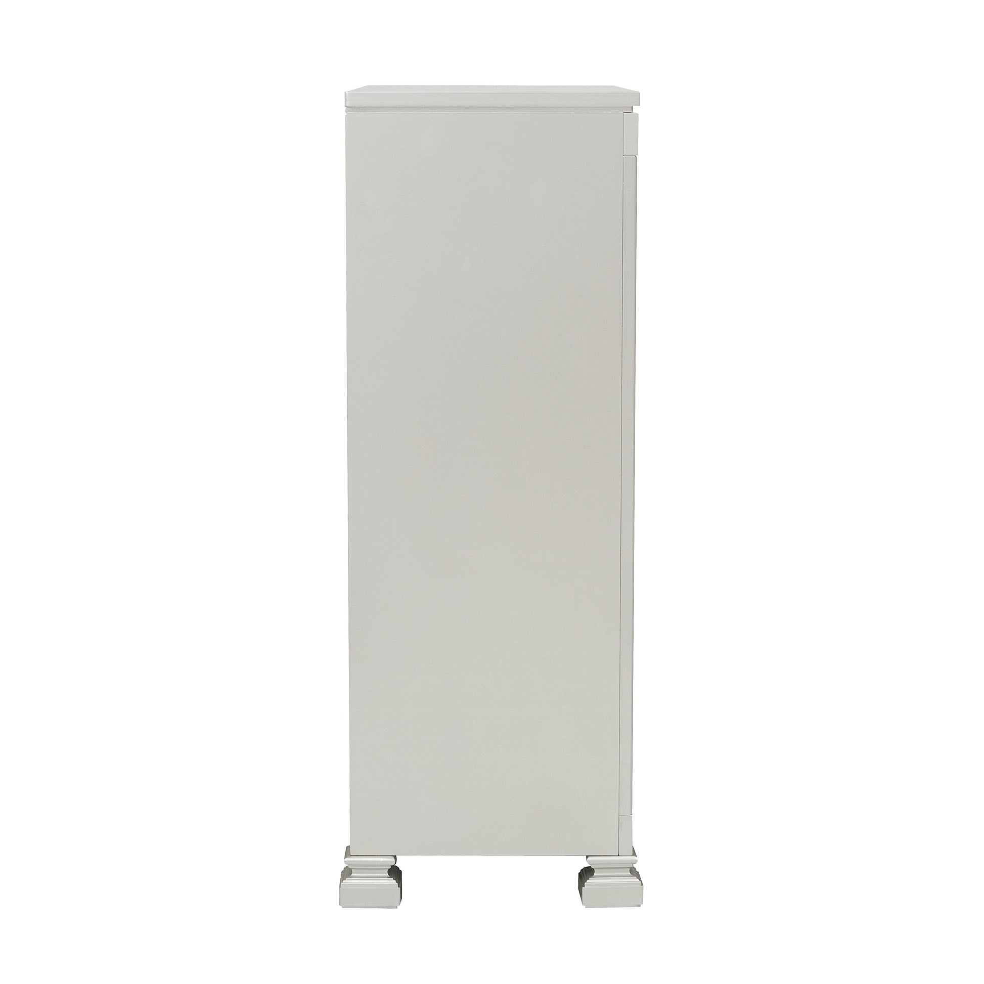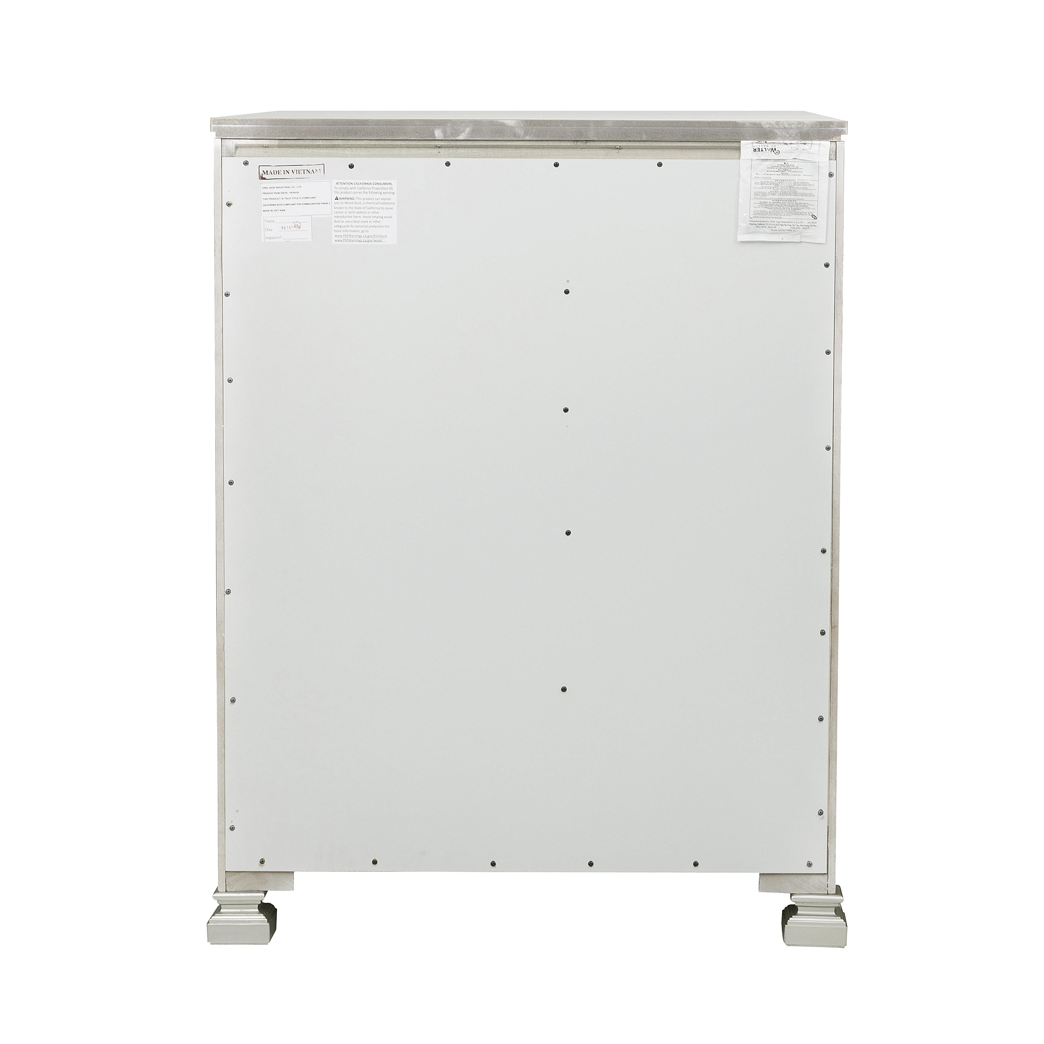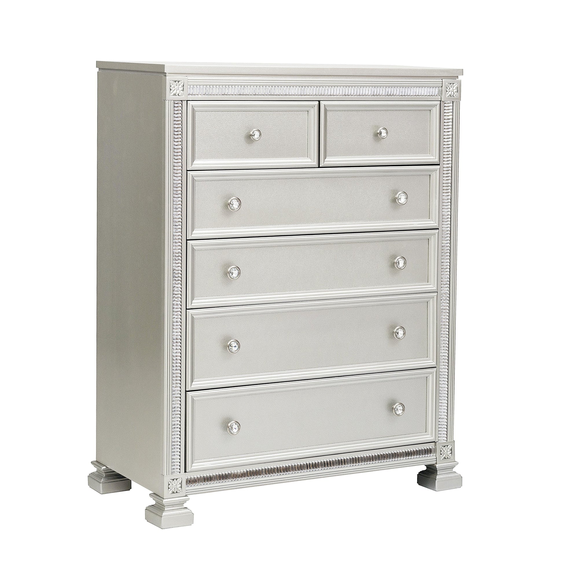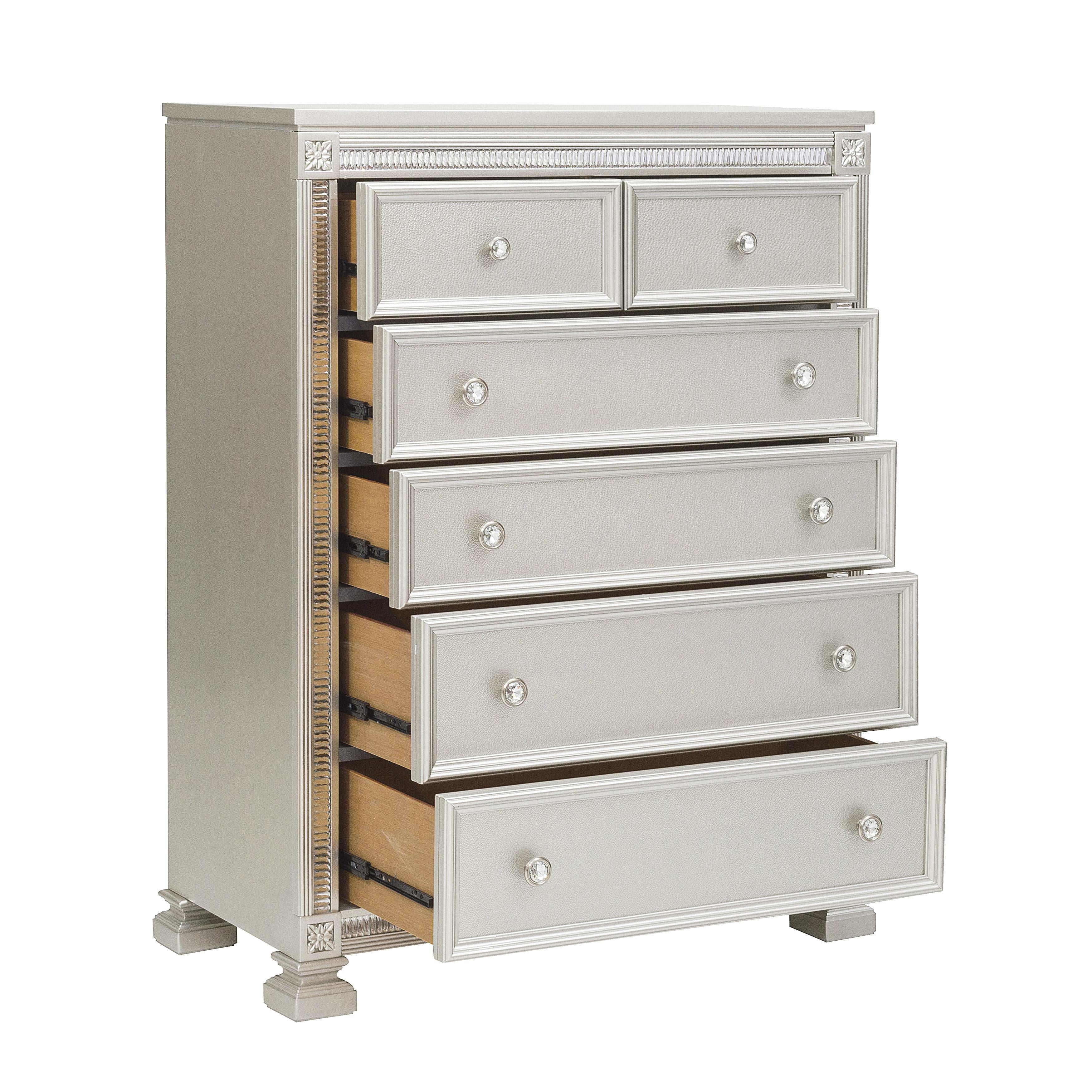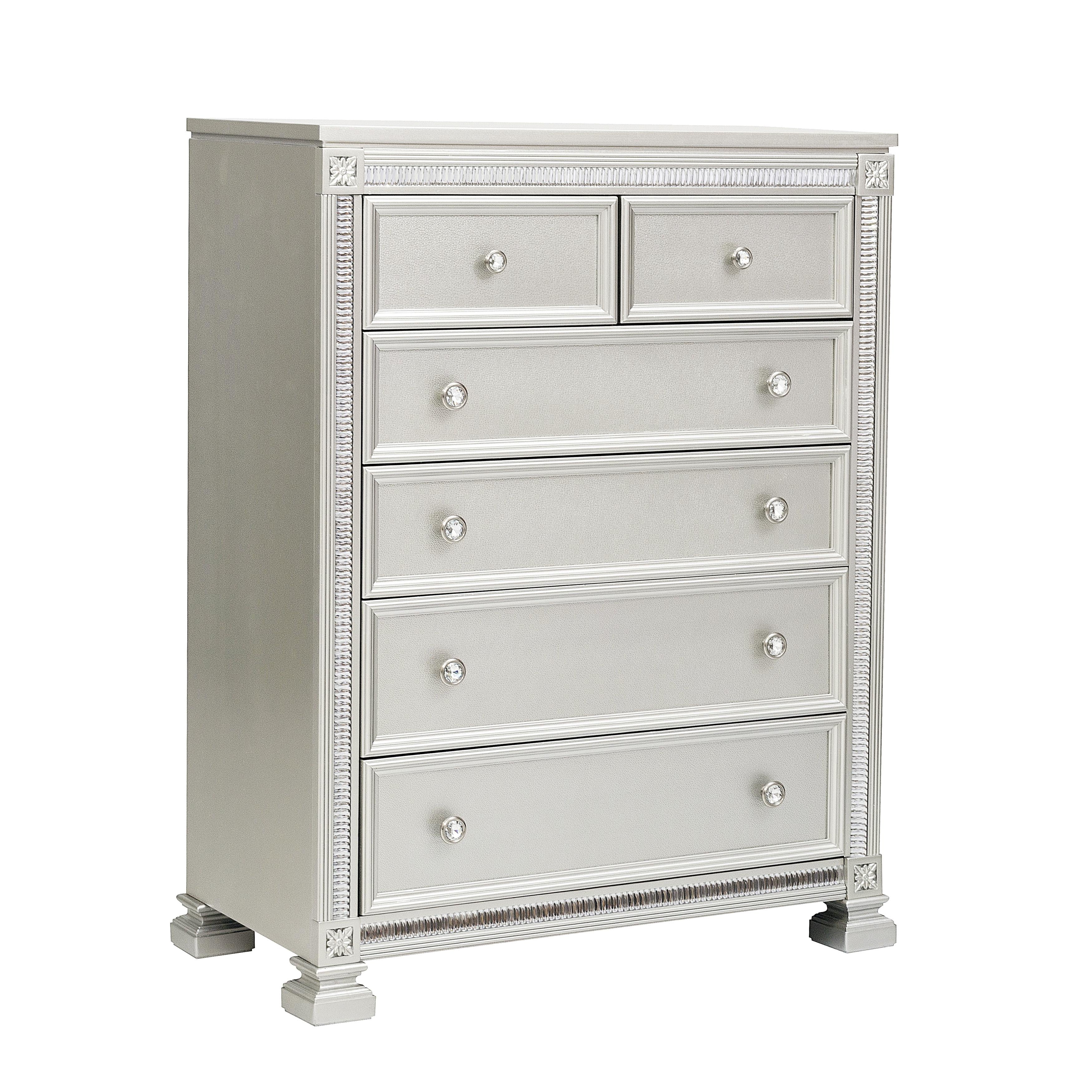 Modern glamour is exemplified in the design of the Bevelle Collection. Acrylic crystals frame the chest, reflecting the light to create eye-catching drama. The silver finish serves as the perfect complement to the high-polish decorative knob hardware and medallion accents.