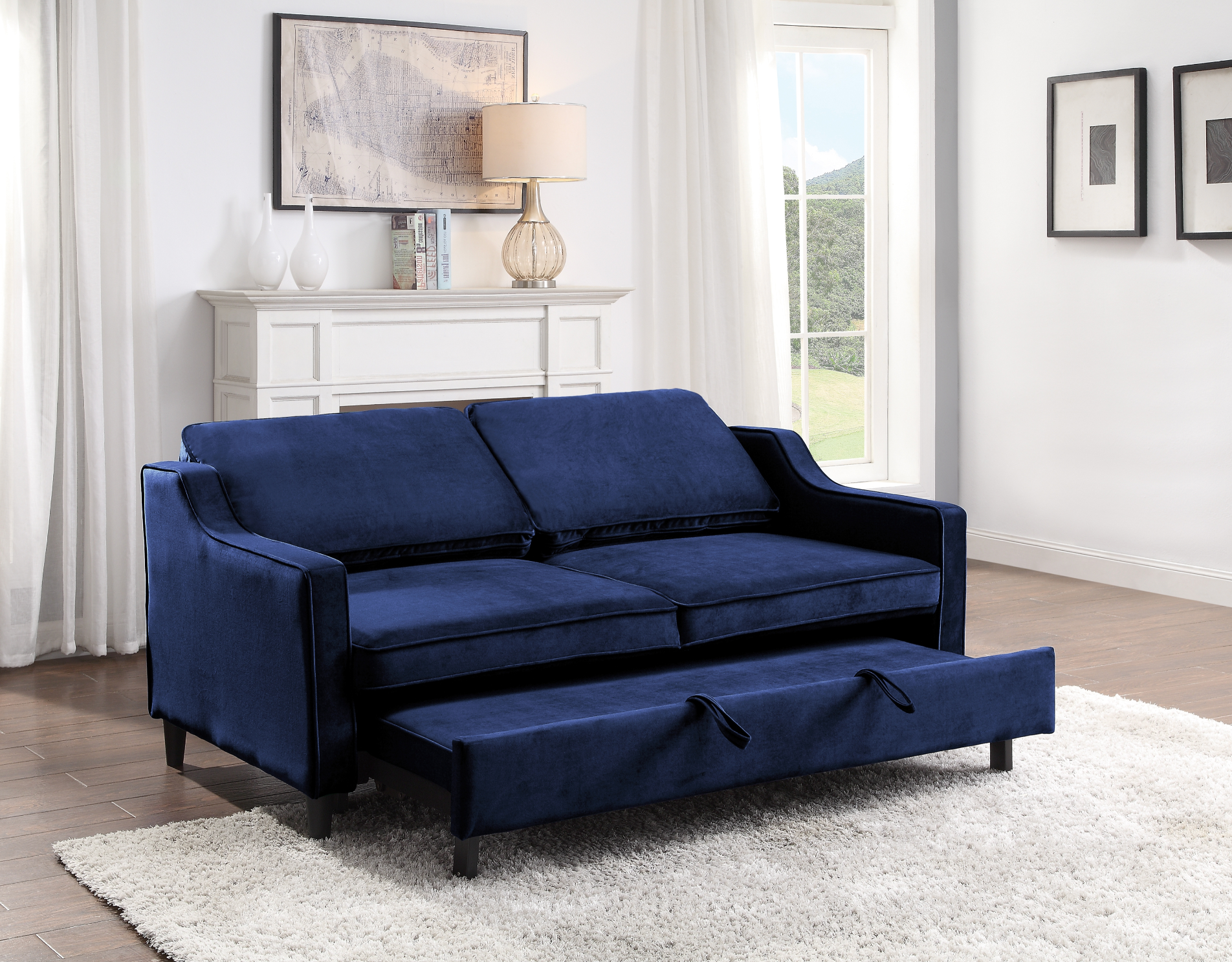 With versatility of function, the Adelia Collection presents as a unique seating option for your household. The pull-out bed and click-mechanism seat back of this sofa engage to create a platform for sleeping or relaxing. The seatback cushions are removable as well as reversible. Offered in navy velvet cover for bold decorative placement and soft touch, the classic profile furthers the placement ability within a number of home environments.