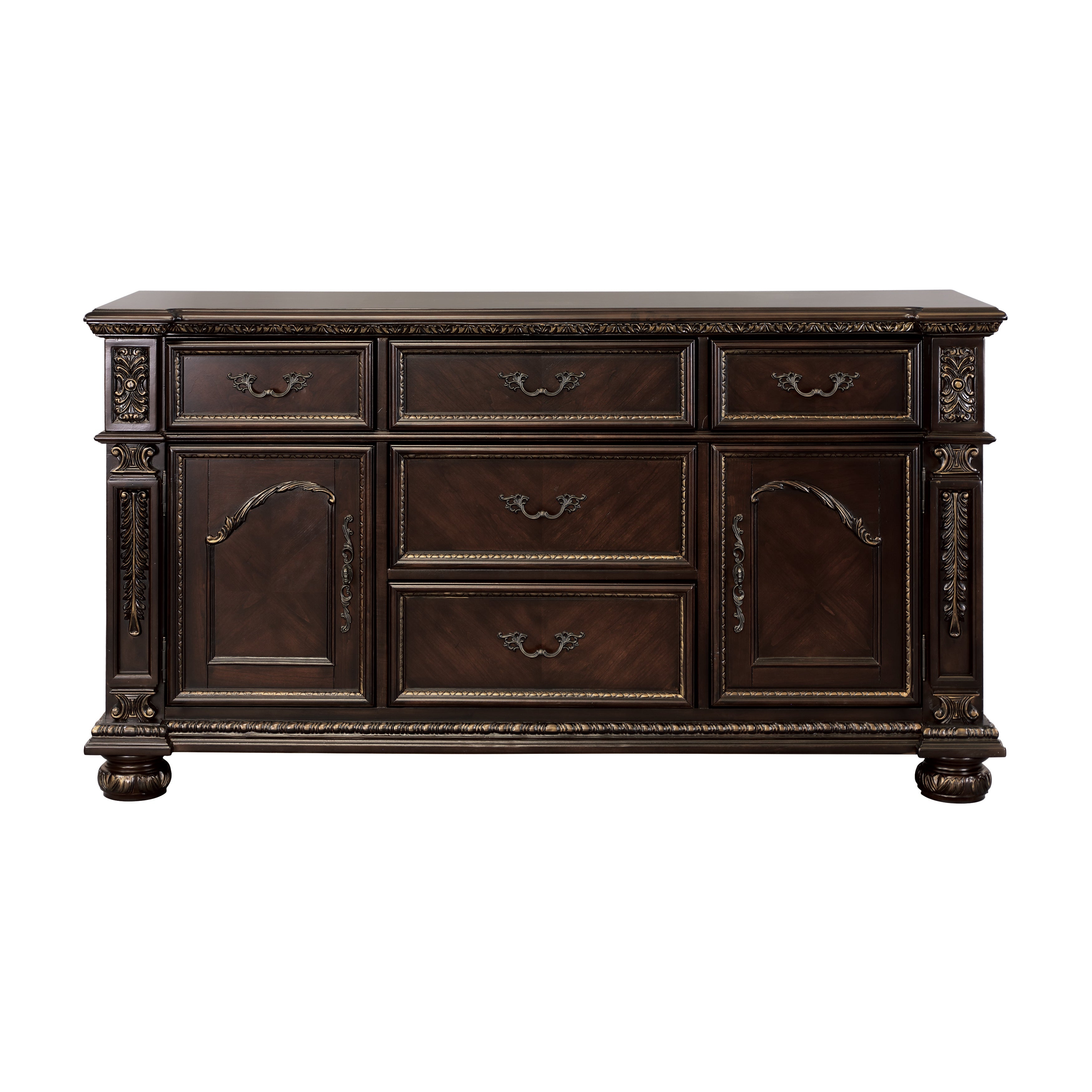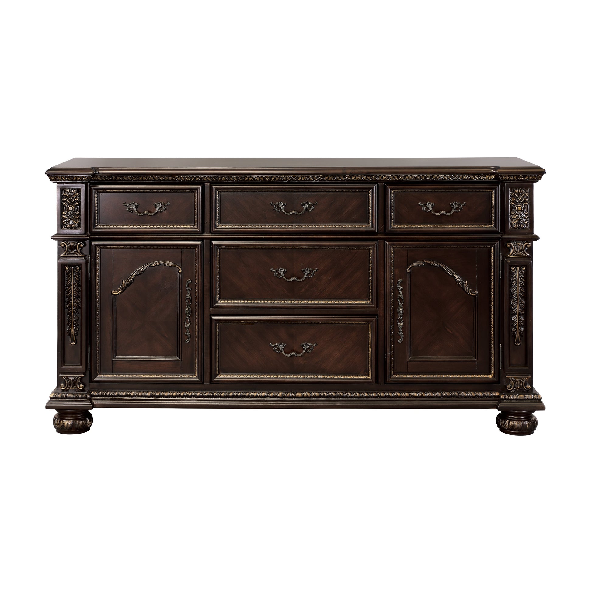 Old-World European styling is captured in the dramatically elegant Catalonia Collection. Traditional design elements reign at every turn – egg and dart molding, acanthus leaf carving, bead molding, gold tipping and extravagant carvings – creating a sophisticated look for your dining room. Each drawer front of the server features dark bronze fixed-drop hardware with decorative flourish that furthers the elegant appointments.