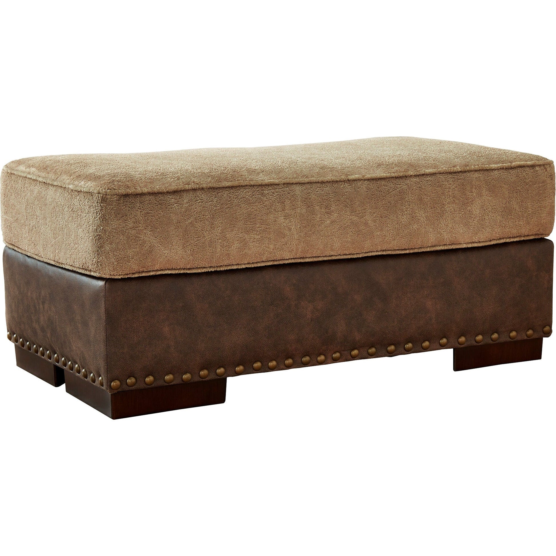 Punctuated by a subtle band of nailhead trim, the cool, contemporary style of this ottoman is perfect for those who love the look of leather. Two textural tones provide twice the style and comfort—and incorporate an added layer of visual interest.