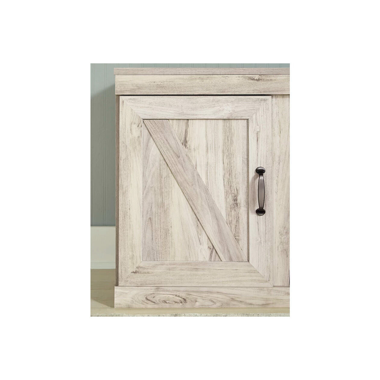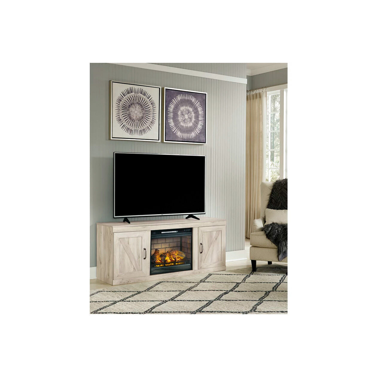 Express your modern farmhouse style with this TV stand with fireplace. Its wispy white finish over replicated oak grain is a delightful change from the ordinary. Clean-lined, classic styling with barn door inspiration provides a country-chic aesthetic that's a breath of fresh air. What really turns up the heat: an electric infrared fireplace insert with faux firebrick surround that operates with or without infrared heat and includes a multi flame feature, 7-level temperature setting, five brightness levels and LED glowing embers effect.