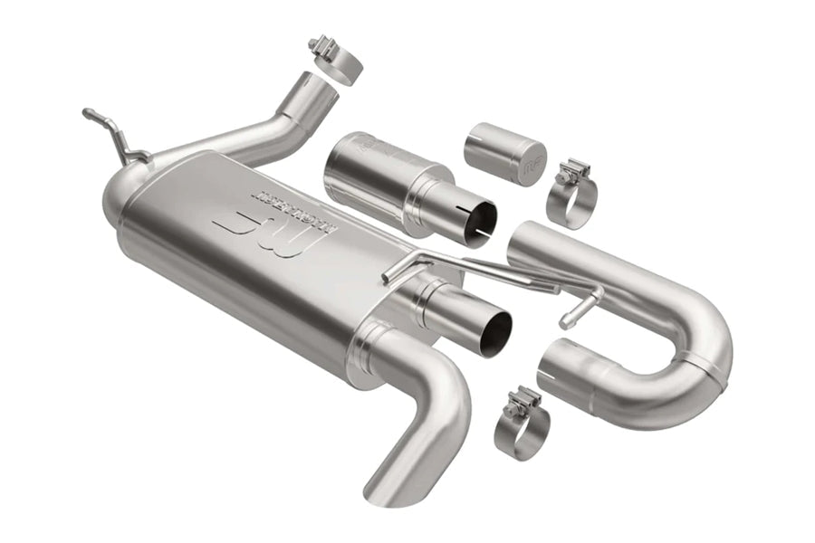 The MagnaFlow Jeep Wrangler JK Overland Series Axle-Back Performance Exhaust System #19668 is engineered for off-road function and built to explore further. This Jeep Wrangler exhaust system is designed for the 2007-2018 Jeep Wrangler equipped with the V6 3.6L or 3.8Lengine option. The high clearance exhaust design of this kit is designed to keep clear of any challenging terrain or obstacles you may come across. #19668 2.5” diameter mandrel bent main piping passes through an 18” straight-through oval muffler and No Drone Technology (NDT) tuned chamber before exiting in a high-clearance tucked tailpipe to the rear of the passenger side.