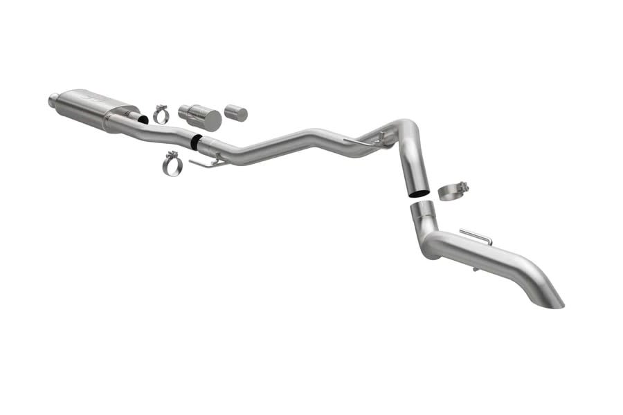 The MagnaFlow Jeep Gladiator Overland Series Cat-Back Performance Exhaust System #19621 brings superior ground clearance, dyno-proven performance and our signature exhaust sound to your 2020-2023 Jeep Gladiator equipped with the 3.6L engine option. This kit’s direct-fit configuration is designed for easy installation and intended to replace your rig’s OEM exhaust components from near the catalytic converter on back. #19621 features 3” mandrel bent main piping that passes through an 18” straight-through oval bodied muffler and NDT (No Drone Technology) tuned chamber before terminating in a high-clearance tucked tailpipe to the rear of the driver’s side. The integration of MagnaFlow’s NDT technology allows this exhaust system to be enjoyed at highway speeds without any unwanted droning noises that can occur in competing exhaust systems. The kit’s high clearance design and improved departure angles versus the stock system allows your truck to handle any terrain more easily. This Jeep Gladiator exhaust system also offers unmatched tunability thanks to the accessory port on the integrated muffler, which allows for different modules to be attached. Exhaust kit #19621 includes an NDT module, which can be attached to that port to further mitigate certain droning frequencies, perfect for longer trips. Alternatively, the port can be covered with the included pipe cap which allows for a more free-breathing engine note to make its way through the pipes. This performance exhaust kit is made of durable, corrosion resistant stainless steel and produced using advanced CNC precision robotic manufacturing techniques, all backed by MagnaFlow’s limited lifetime warranty.