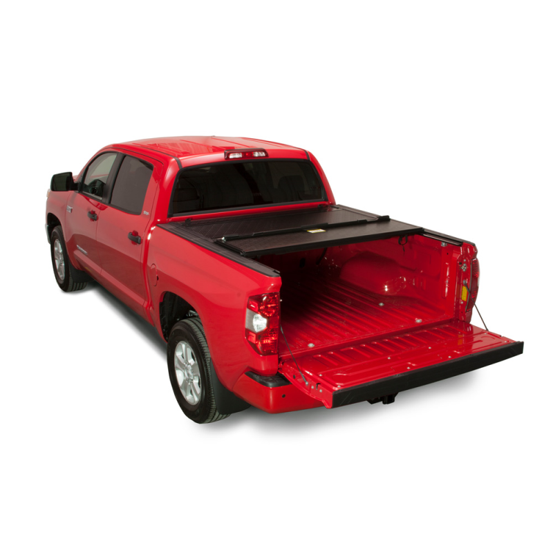 BAK BAKFlip FiberMax Hard Folding Truck Bed Cover - Rail Mounts Near Top of Bed Rail - Rails Can Be Lowered Using Drop Down Brackets - 2022-2024 Toyota Tundra 5' 7" Bed with or without Deck Rail System w/out Trail Special Edition Storage Boxes Model 1126440