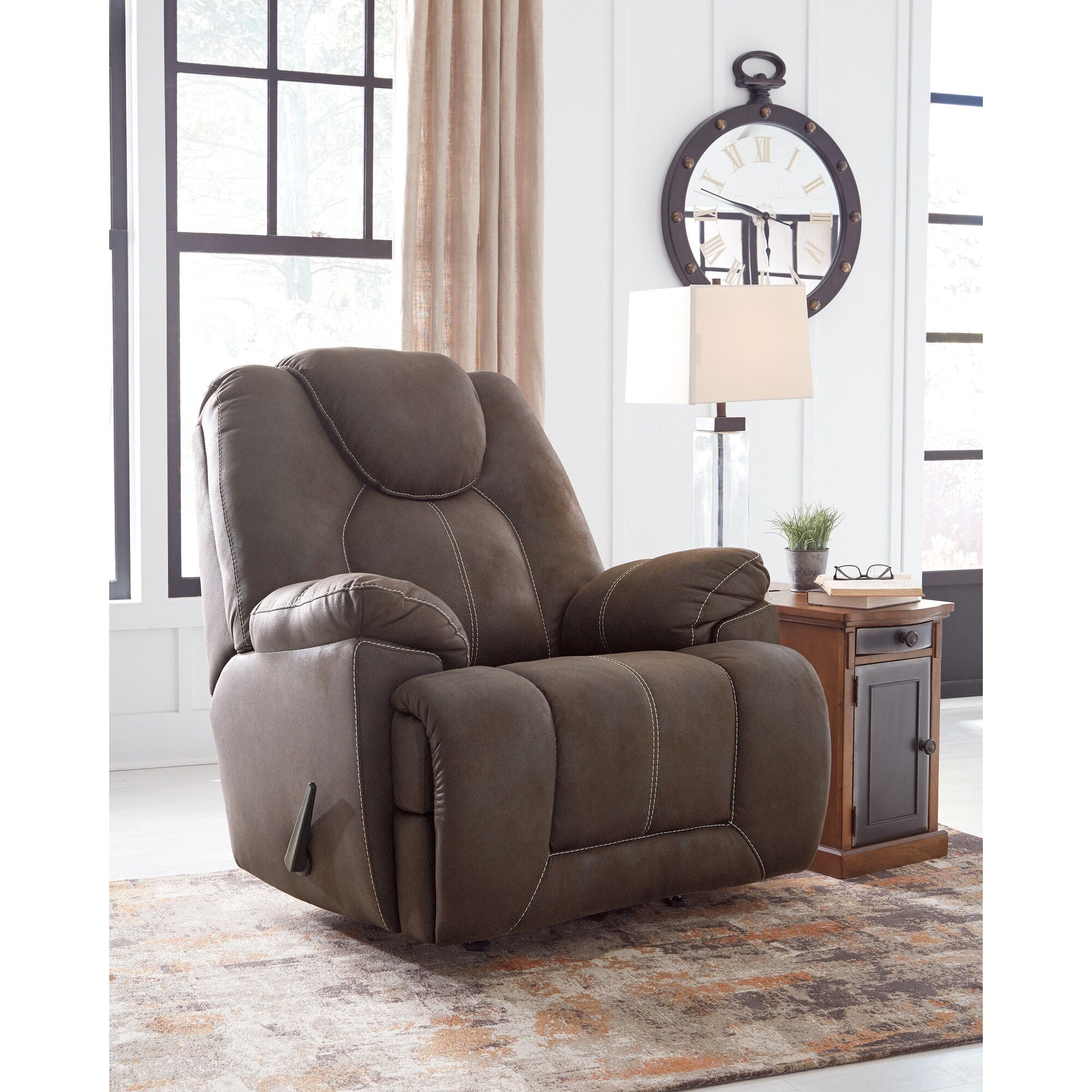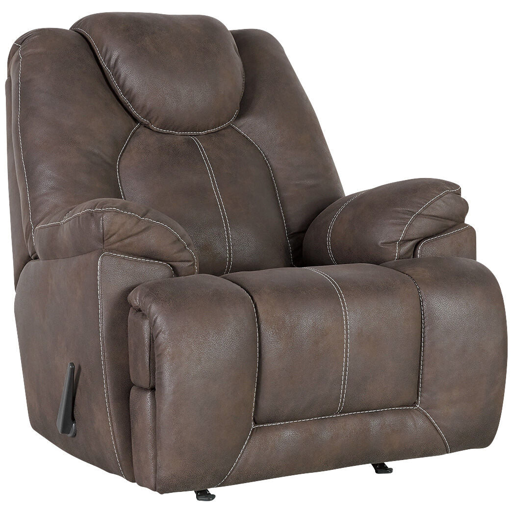 Lay back and sink into the web exclusive Warrior Fortress Recliner, complete with a one-pull reclining feature and gentle rocking motion for ultimate relaxation. Get the leather look without the high price tag when you purchase this recliner, with high-resiliency foam cushions wrapped in thick poly fiber and durable polyester/polyurethane upholstery that's easy-to-clean, too. With attached cushions, this faux leather upholstery is more than comfortable; it's sturdy, too. There's nothing lacking in this coffee-brown recliner. Its padded seats, headrests, and armrests are enriched with heavyweight baseball stitching for a look that's chic and classic with, a sporty aesthetic all at the same time. It's inspired by luxury car interiors, with a corner-blocked frame with reinforced stability. An oversized headrest pillow and high back profile elevate the experience even further, making sure you're rested and rejuvenated each time you take a seat in this power rocker recliner. Feel exceptional comfort today when you bring home the Warrior Fortress Power Recliner from Slumberland.