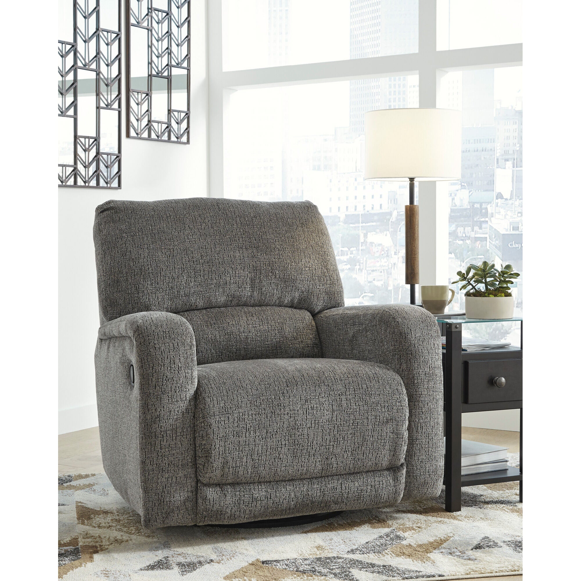You and plush cushions are two peas in a pod. That's why this swivel glider recliner will quickly find its way to your heart. Chenille fabric feels so good, you'll never want to take your hands off of it. Track arms elevate the look with a touch of contemporary sensibility. Ease back into relaxation on the deep seating with one easy pull. Complete with 360-degree swivel, this recliner sets the bar for comfort. - Product Details provided by Manufacturer, Slumberland not responsible for errors in information.