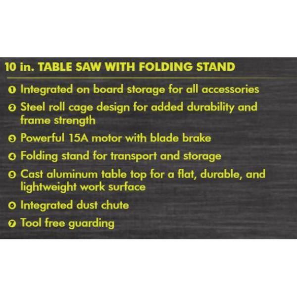 RYOBI introduces the 15 Amp 10 in. Table Saw with Folding Stand. This saw features a 15 Amp motor and 5000 RPM to complete even the toughest DIY or professional jobs. The 15 Amp 10 in. Table Saw features integrated storage for accessories and a durable cast aluminum table top surface. The included stand is foldable for easy transport and storage. Backed by the RYOBI 3-Year Manufacturer's Warranty, the 15 Amp 10 in. Table Saw includes the Folding Stand with mounting hardware, a 10 in. blade, a push stick, a miter gauge, a rip fence, guarding assembly, anti-kickback pawls, and an operator's manual.