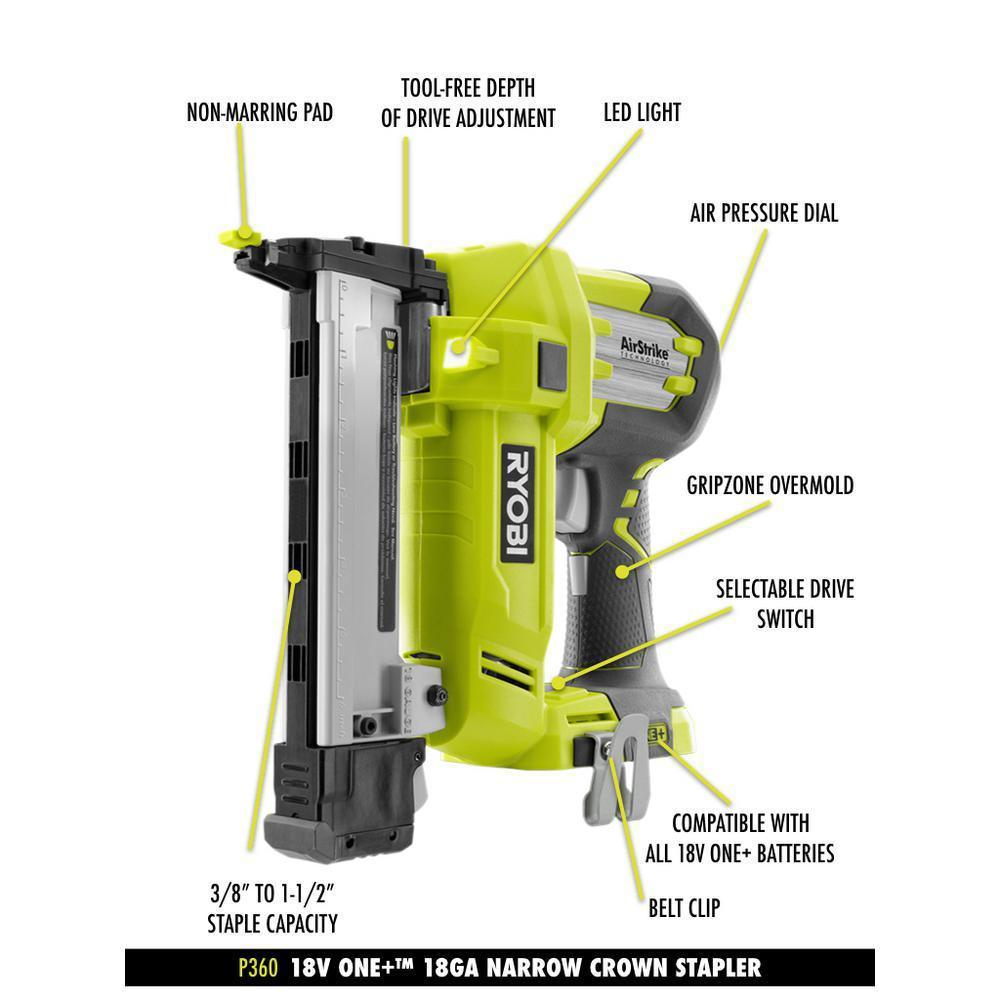 - Includes: (1) P325 18-Volt ONE+ AirStrike 16-Gauge Straight Finish Nailer with belt clip and sample nails, (1) P360 18-Volt ONE+ Lithium-Ion Cordless AirStrike 18-Gauge Cordless Narrow Crown Stapler with belt clip and sample staples, (1) P190 2.0 Ah Compact Lithium-Ion Battery, (1) P118 18-Volt ONE+ Dual Chemistry Charger with IntelliPort Technology, and operator's manuals