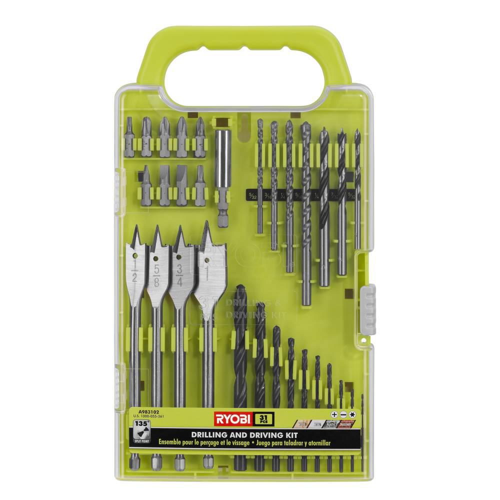 - Drill and Drive Kit: Includes up to a 1 in. spade bit, as well as Phillips, slotted, torx driving bits, and carbide tip masonry bits