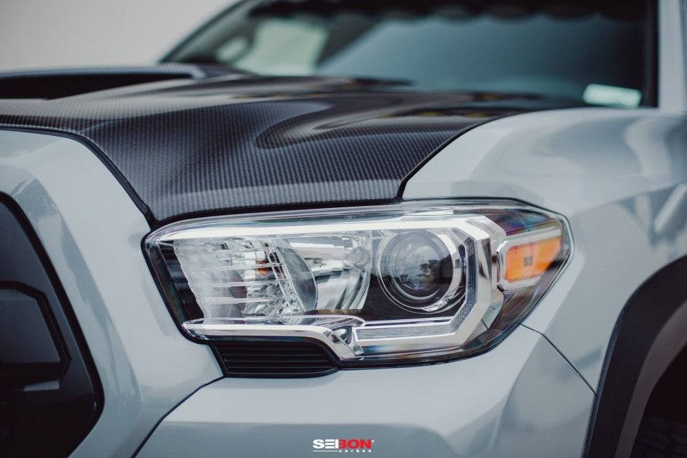 The 2016+ Toyota Tacoma Seibon TR-Style Carbon Fiber Hood features a hood scoop similar to the Toyota Tacoma TRD-Sport Hoods! Seibon Carbon designs and produces the best carbon fiber hoods the 3rd Gen Toyota Tacomas! Make your 2016+ Toyota Tacoma stand out and save weight with this Carbon Fiber hood, match it up with the Seibon Tacoma Fender Flares!