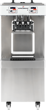 The 6250A-C is a premium twin twist (two flavor) floor standing, pressurized (air pump) soft serve machine. Capable of producing a variety of soft serve products including ice cream, frozen yogurt, custards, and sorbets. Easy to use dual digital user interface and control system maintains excellent product consistency, hopper temperature, and high-performance parameters. Hopper refrigeration and sleep/standby feature keep product fresh and is approved for dairy or non-dairy products. The Spaceman air pump system allows you to choose between six overrun settings, giving you the ability to add even more air to the product, yielding higher profits, creamier, fluffier, and lighter product. Add an air pump anytime you wish to dip cones, swirl extra high, or get that light Instagram famous look! Hopper agitators stir product throughout the day, saving operator time and ensuring consistent dairy safe cooling in the hopper. Patented freezing technology on the 1.8qt cylinders means a super-fast recovery time, capable of producing over 350 small 4oz servings per hour. Spaceman soft serve freezers have patented technology to prepare and freeze product faster and more efficiently than any competitor. Spaceman' s revolutionary V2 beater and PAR (product to air ratio) system reduces wearable parts by over 25% while improving product quality and overrun control. The V2 beater and blade system scrape the cylinder walls to ensure less ice buildup - creating smoother, creamier product. The 6250-C comes equipped with four heavy duty rotating and locking caster wheels and an eight foot cord and plug.