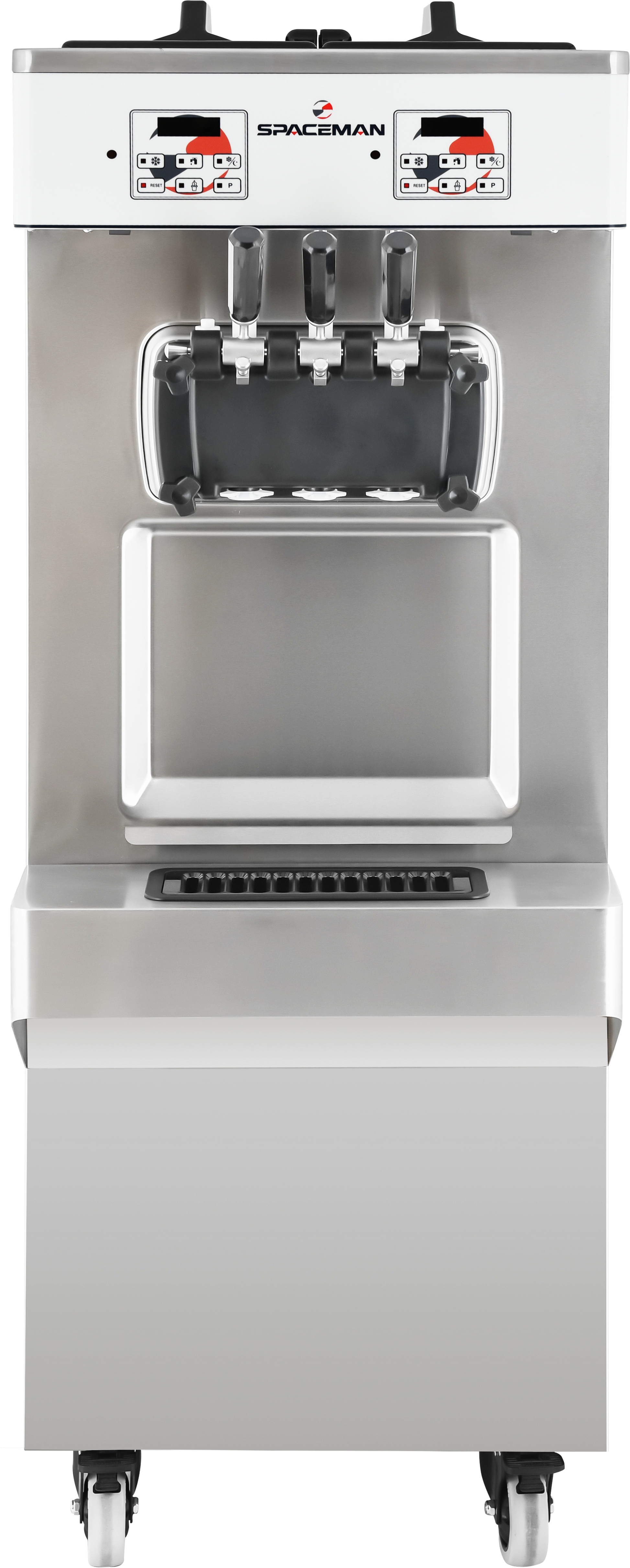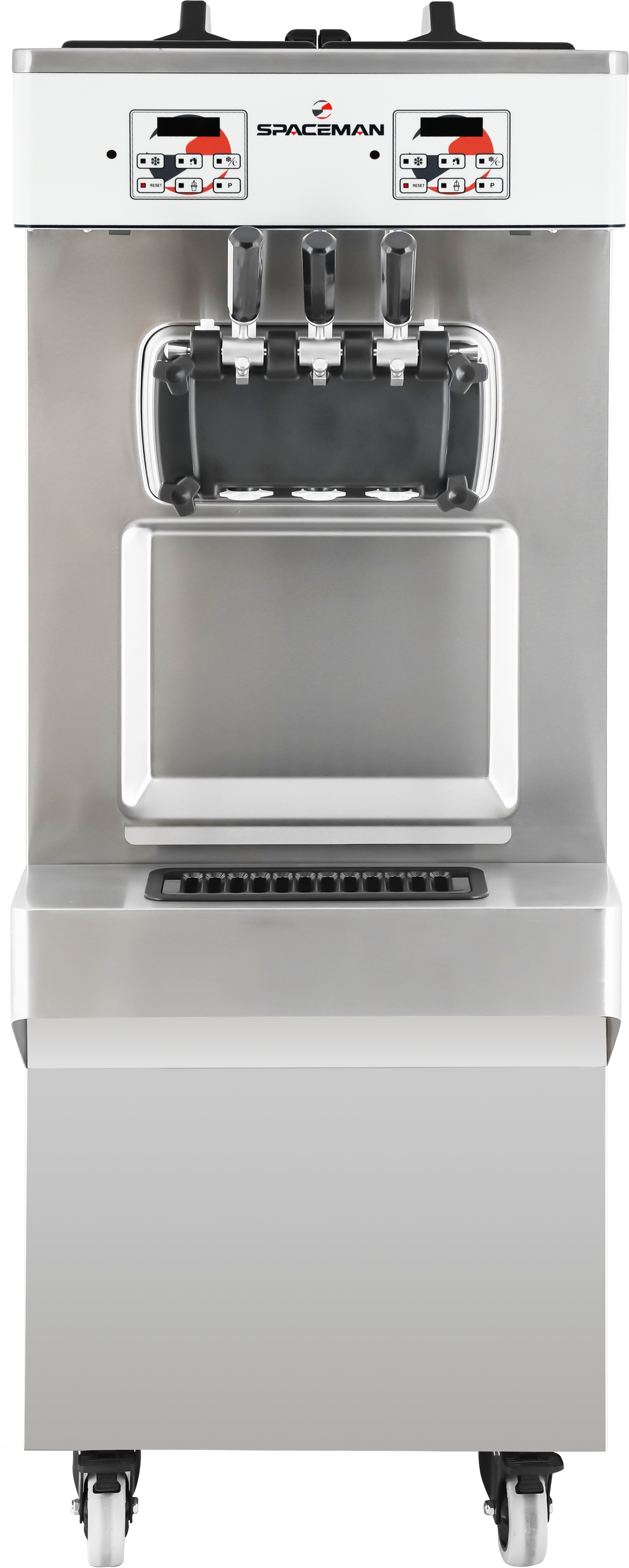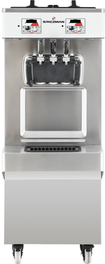 The 6378A-C is a twin twist (two flavor) floor standing, pressurized (air pump) soft serve machine. Ideal for high volume locations with servings up to 12oz. Capable of producing a variety of soft serve products including ice cream, frozen yogurt, custards, and sorbets. Easy to use dual digital user interface and control system maintains excellent product consistency, hopper temperature, and high-performance parameters. Hopper refrigeration and sleep/standby feature keep product fresh and is approved for dairy or non-dairy products. The Spaceman air pump system allows you to choose between six overrun settings, giving you the ability to add even more air to the product, yielding higher profits, creamier, fluffier, and lighter product. Add an air pump anytime you wish to dip cones, swirl extra high, or get that light Instagram famous look! Hopper agitators stir product throughout the day, saving operator time and ensuring consistent dairy safe cooling in the hopper. Patented freezing technology on the 3.4qt cylinders means a super-fast recovery time, capable of producing over 700 small 4oz servings per hour. Spaceman soft serve freezers have patented technology to prepare and freeze product faster and more efficiently than any competitor. Spaceman' s revolutionary V2 beater and PAR (product to air ratio) system reduces wearable parts by over 25% while improving product quality and overrun control. The V2 beater and blade system scrape the cylinder walls to ensure less ice buildup - creating smoother, creamier product. The 6378A-C comes equipped with four heavy duty rotating and locking caster wheels and an eight foot cord and plug.