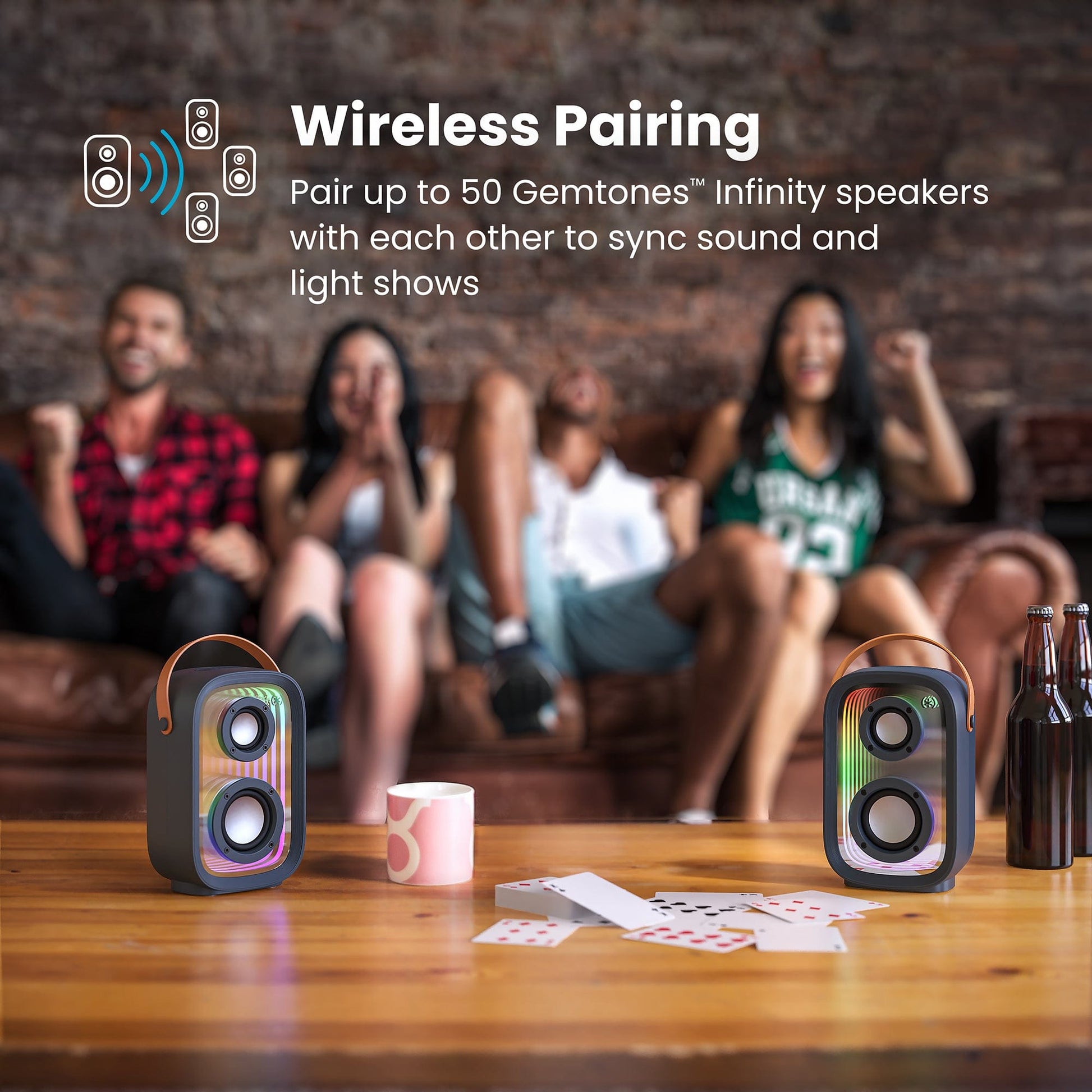 But the beauty doesn’t stop there. The Infinity Speaker boasts next-level tech to transform any experience. Take your parties to new heights with 6 customizable light shows that react to your music. The free Speck Gemtones App lets you personalize everything from light modes to volume levels and EQ profiles, ensuring your sound is perfectly tailored.