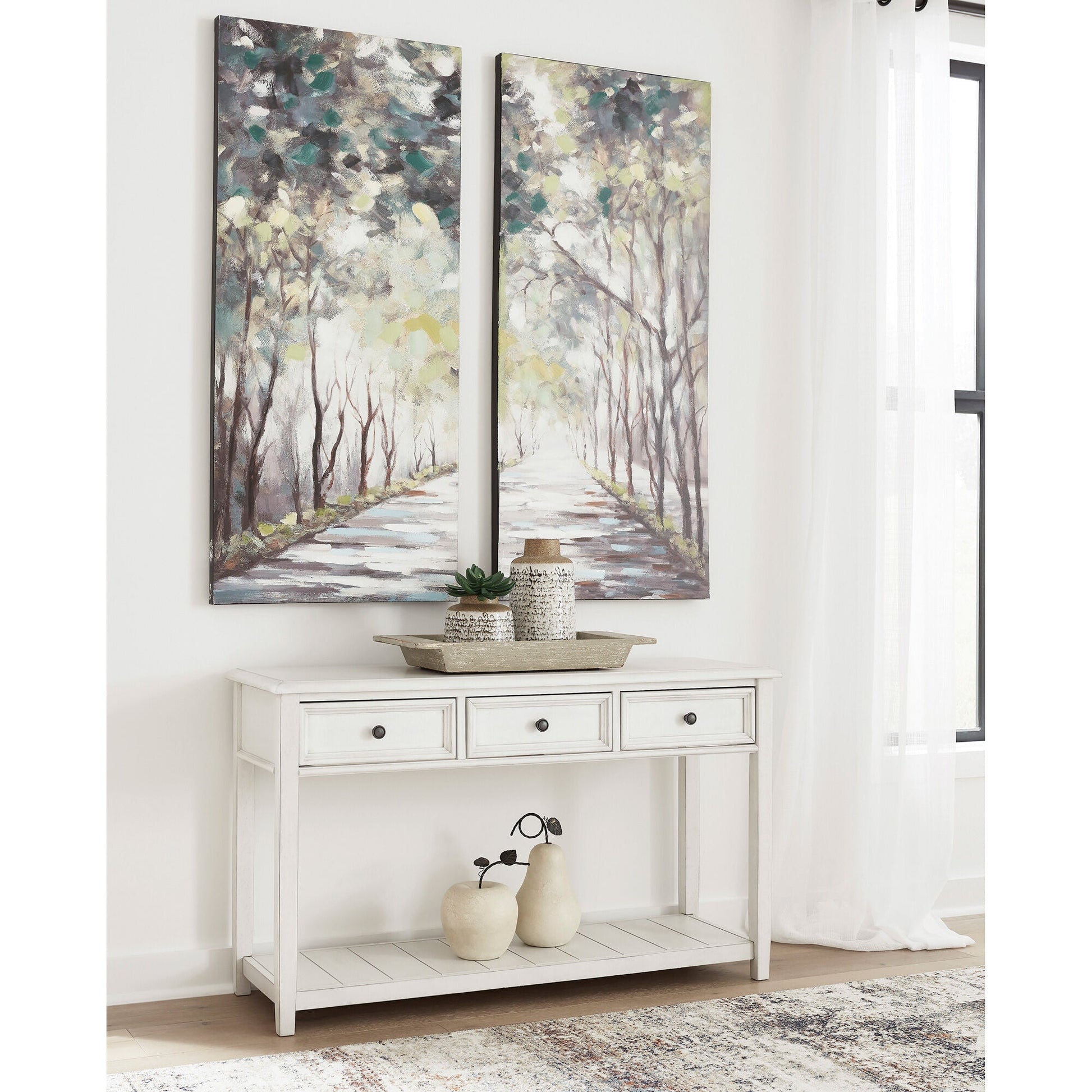 The Kanwyn Sofa Table by Ashley Furniture demonstrates the intersection of style and functionality famously. The whitewashed finish means that it can go with multiple decorative styles, including coastal or cottage core. This piece has three handy drawers and metal hardware slides. Use the extra storage for keys, remotes, power cords, etc. You can either place this behind a sofa, as the name implies or in a foyer or hallway. You can order this piece online or see it in person at your local Slumberland. Measure your sofa or space before ordering.