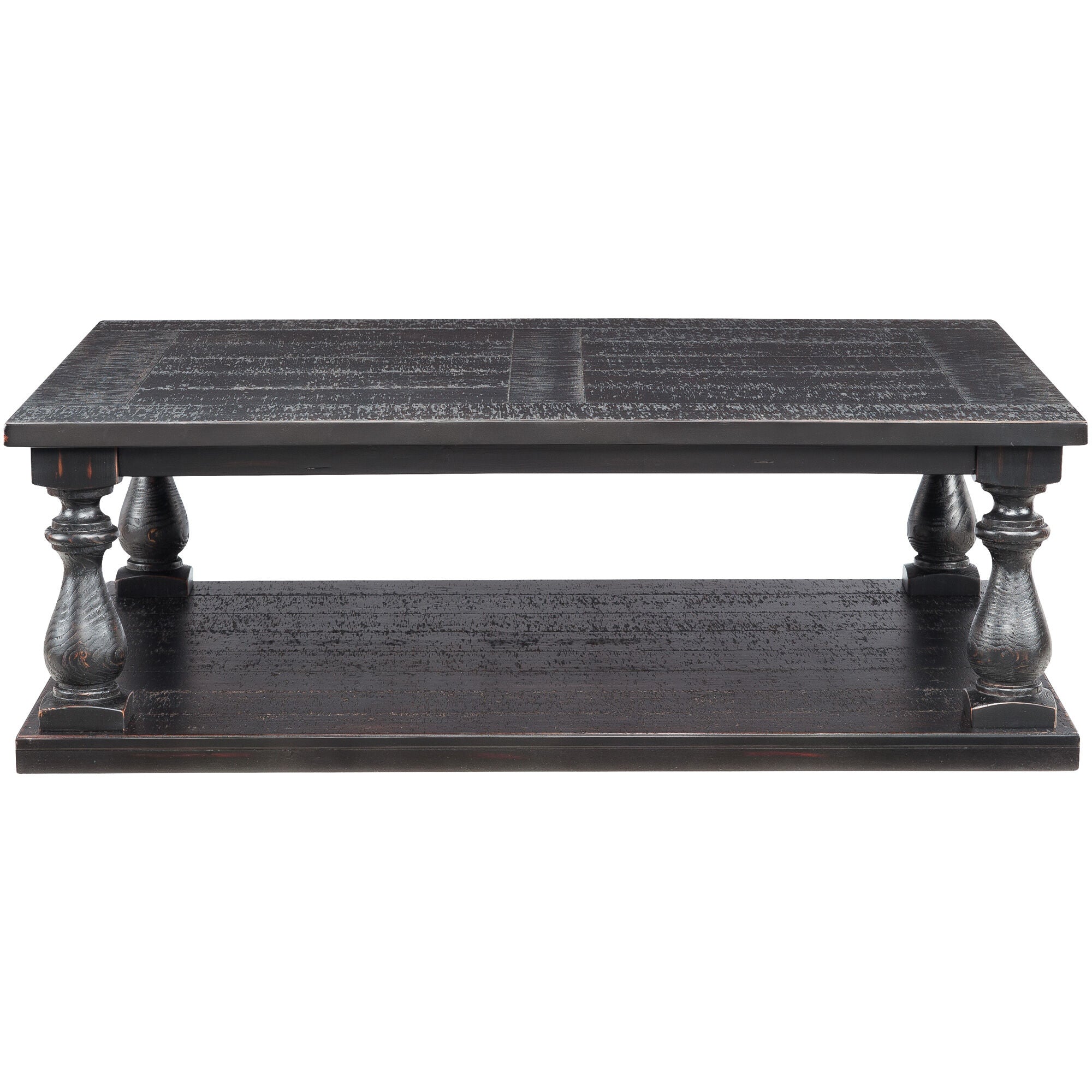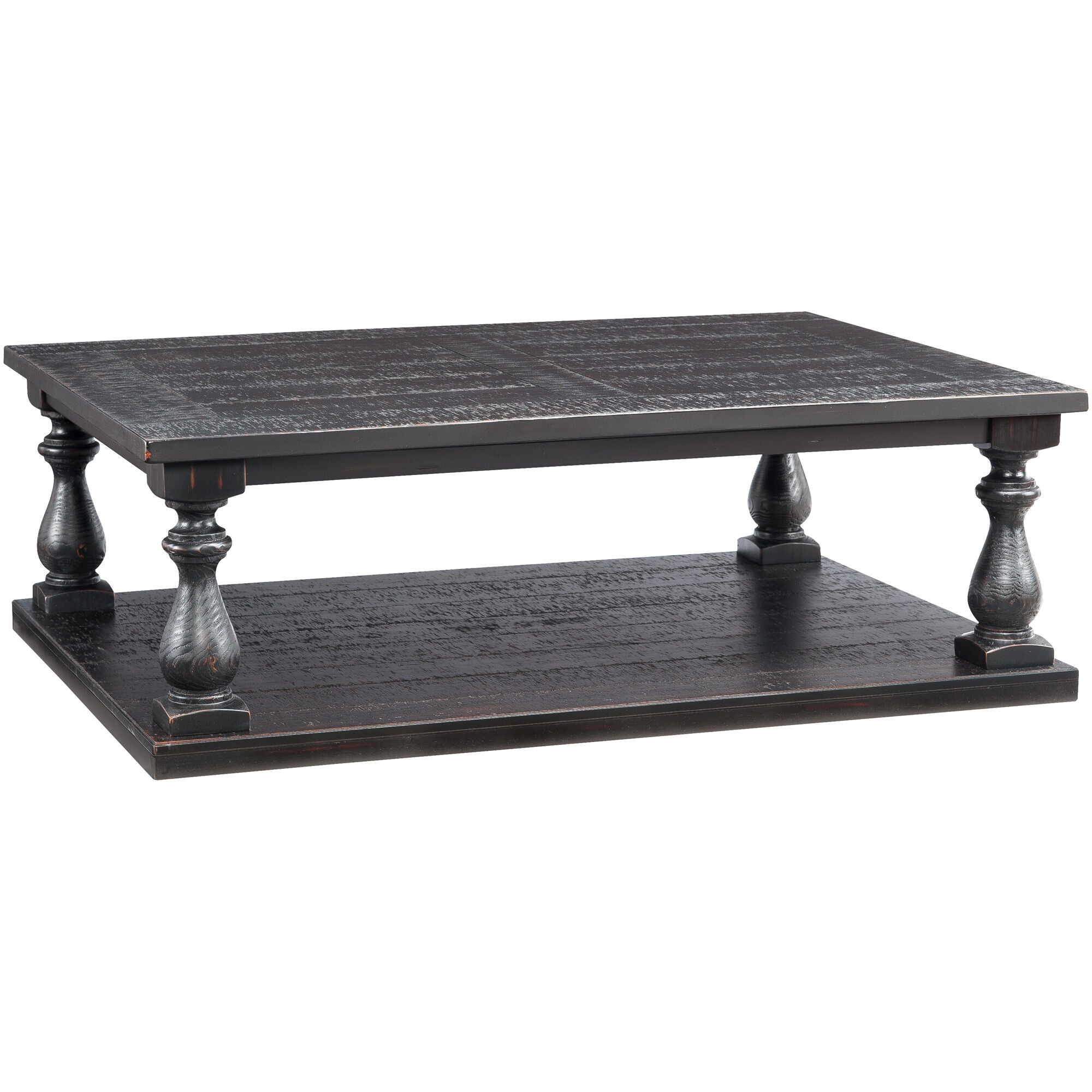 The Mallacar plank coffee table has a sturdy, substantial look that's destined to be the cornerstone of your seating area. The square shape is ideal for access from multiple sides, and a full lower shelf lets you store everything underneath, keeping the beautiful plank top free of clutter. Constructed of solid wood planks, thick veneer, and engineered wood, this cocktail table has wirebrushed detailing for a charming aged look. Complement your traditional or eclectic décor with Mallacar.