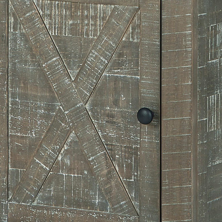 A rustic rendition of modern farmhouse style, the Pierston End Table creates a relaxed look and feel in your home. The simple, hearty profile is elevated with a distressed gray finish and rough-hewn plank details. The crossbuck door front and black metal door pull add decorative flair and a single shelf to keep your magazines, books, and other items sorted and organized. Wonderfully versatile, the Pierston End Table brings form and function to virtually any space in your home. Ideal for farmhouse, transitional or eclectic interiors, it gives a vintage that livens up bedrooms and family rooms with simple and stylish storage.