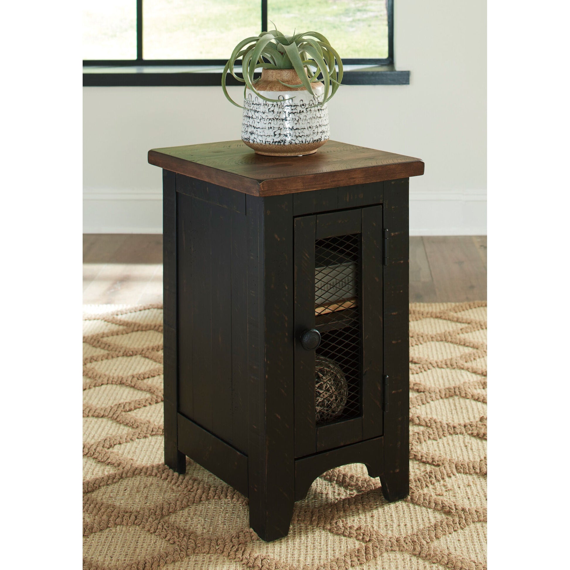 The Valebeck chairside table brings rustic farmhouse chic into your living room (or family room or den or …). This diminutive table is loaded with charm, from the plank-style top to the distressed finish to the mesh inset in the door. The storage compartment has an interior shelf, and gives you just enough room for a couple of books, remotes, or candles. This end table is made with pine veneers, pine wood and engineered wood.
