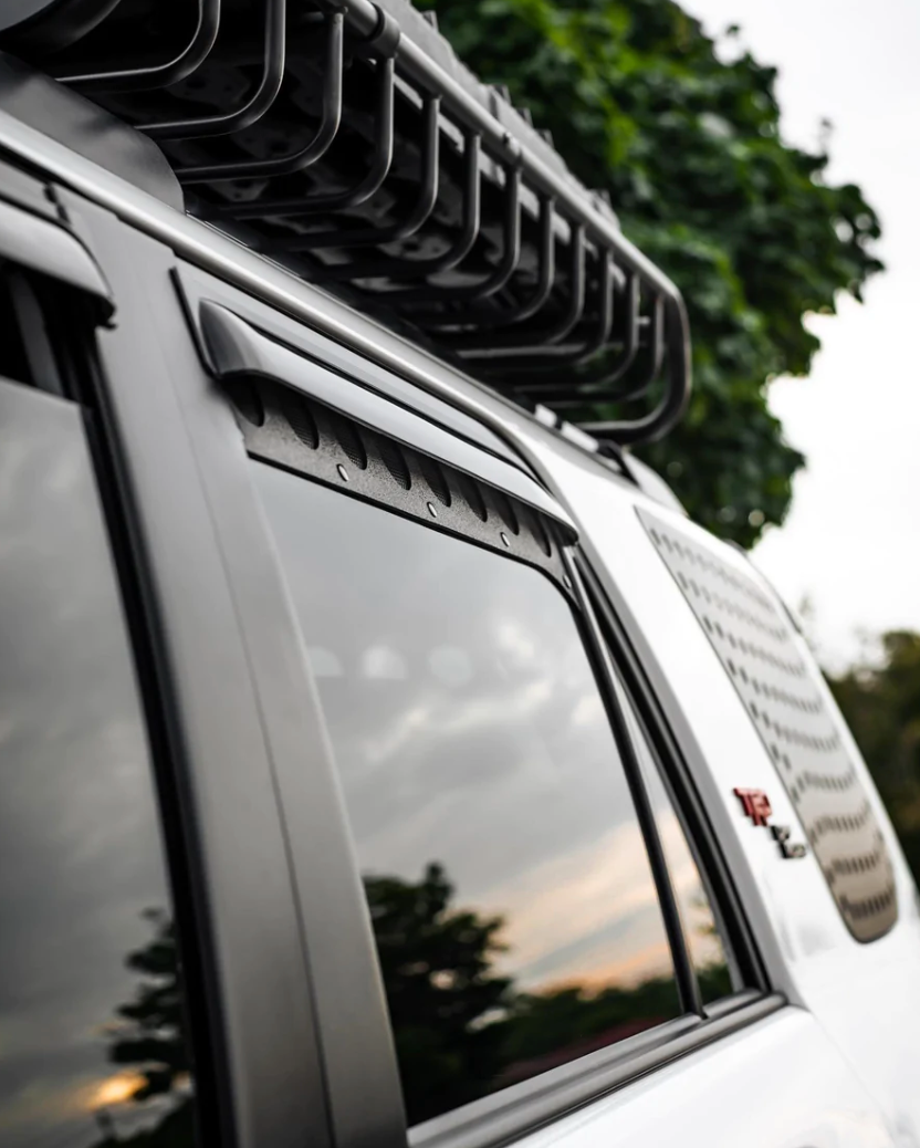 These window vents for your 2010 - 2022 Toyota 4Runner 5th gen can be used in several ways. Camping to prevent insects from entering the cabin with our mesh screen insert, daily driving to eliminate wind turbulence or if you have pets in the back seat, or stand out from the others at a show.